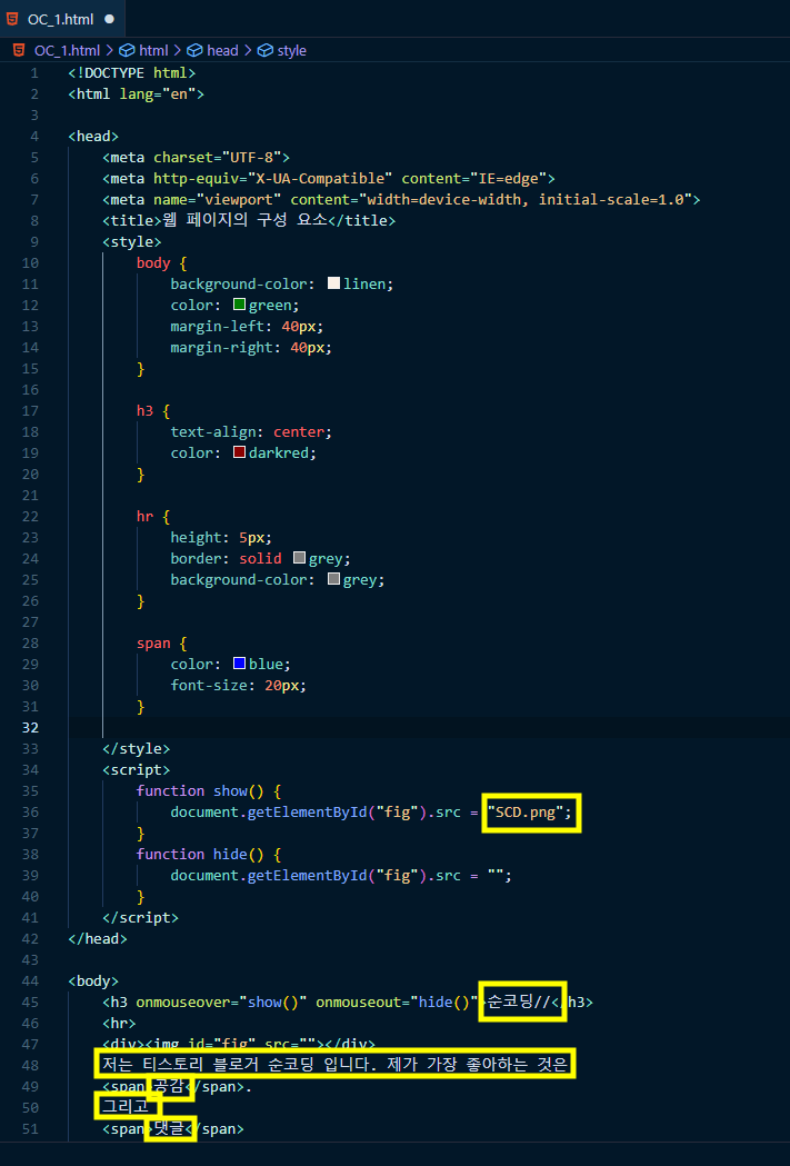 <h3 onmouseover="show()" onmouseout="hide()">순코딩//</h3>