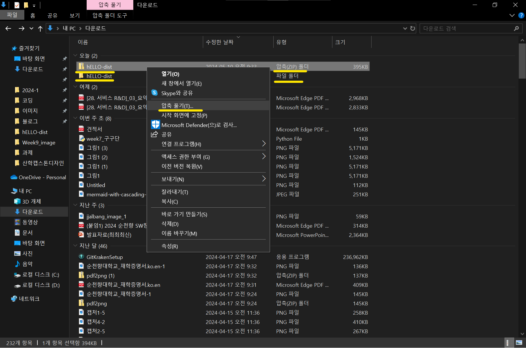 해당 압축 폴더를 우클릭하여 압축 풀기를 실행하면 hELLO-dist 파일 폴더가 생성됩니다.