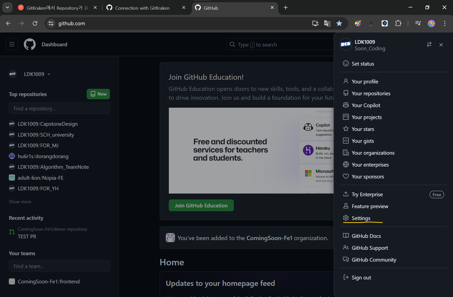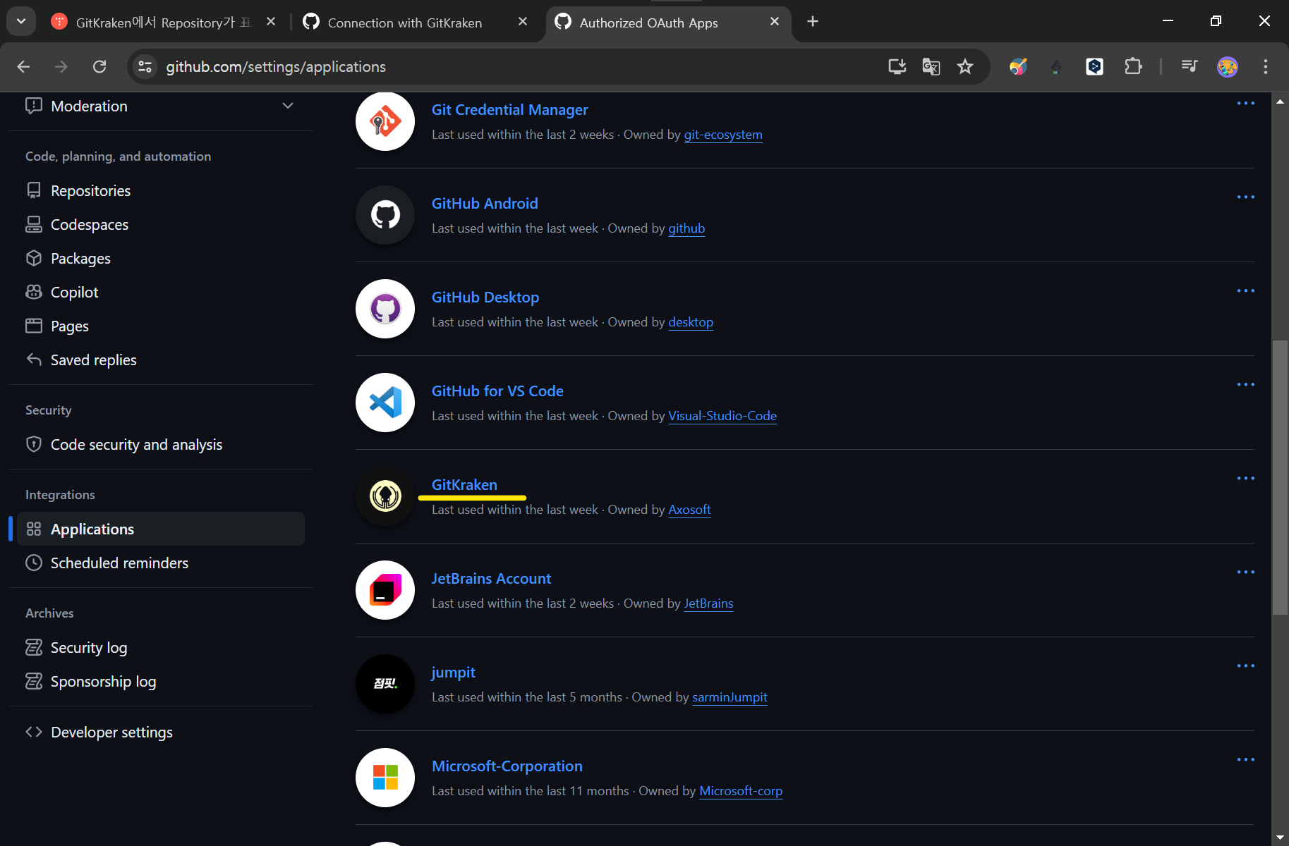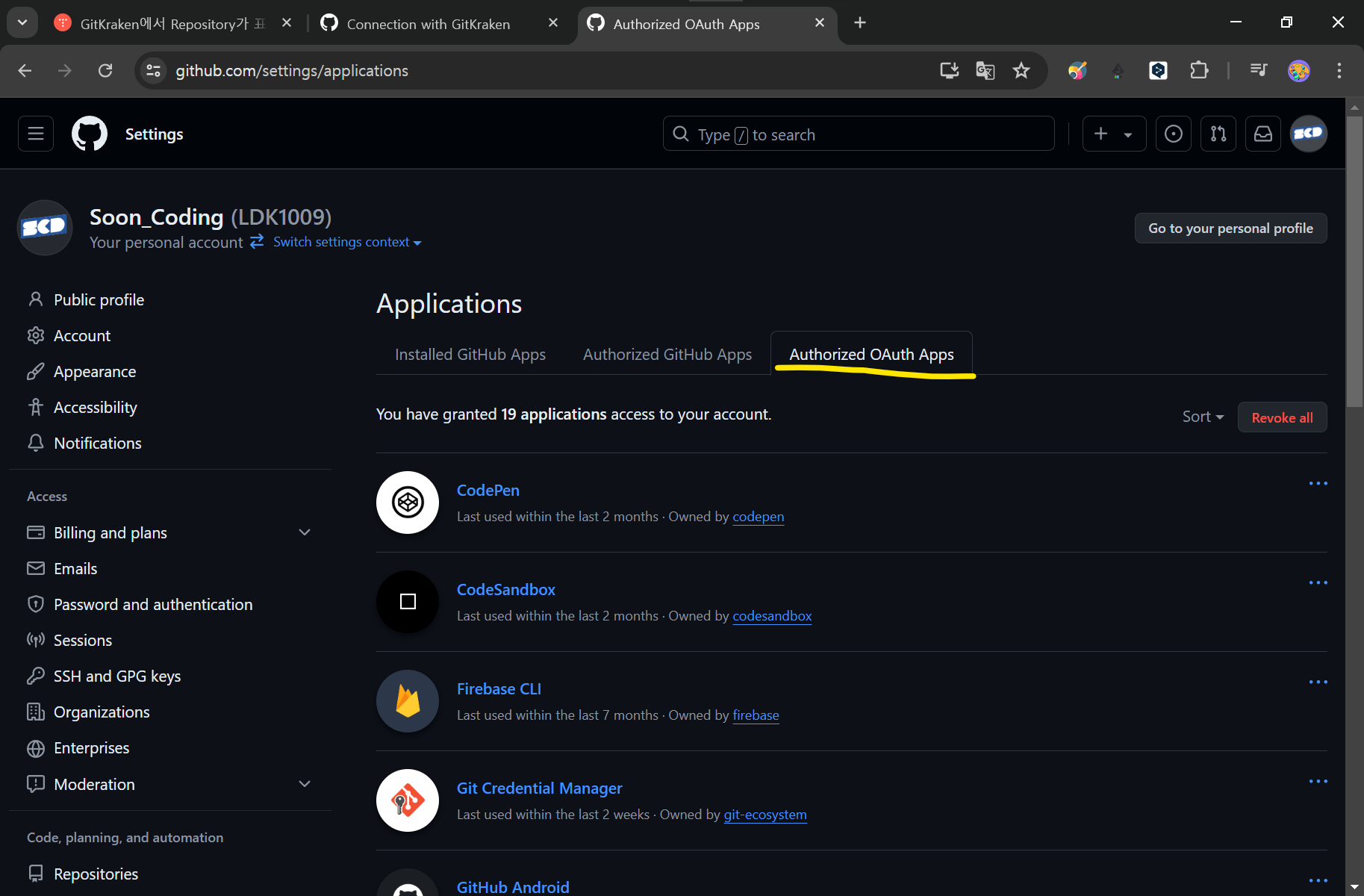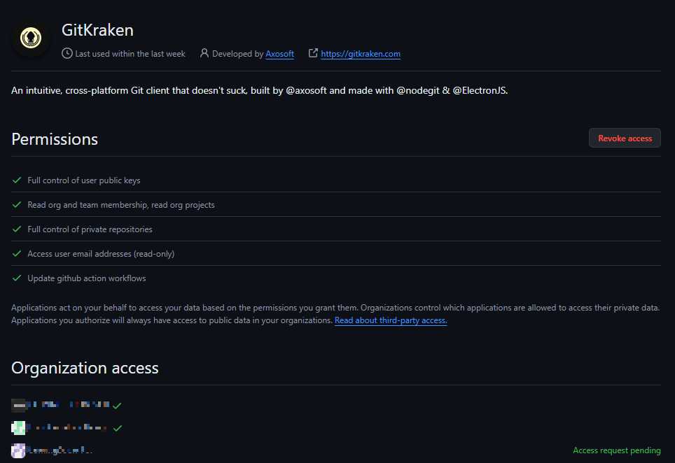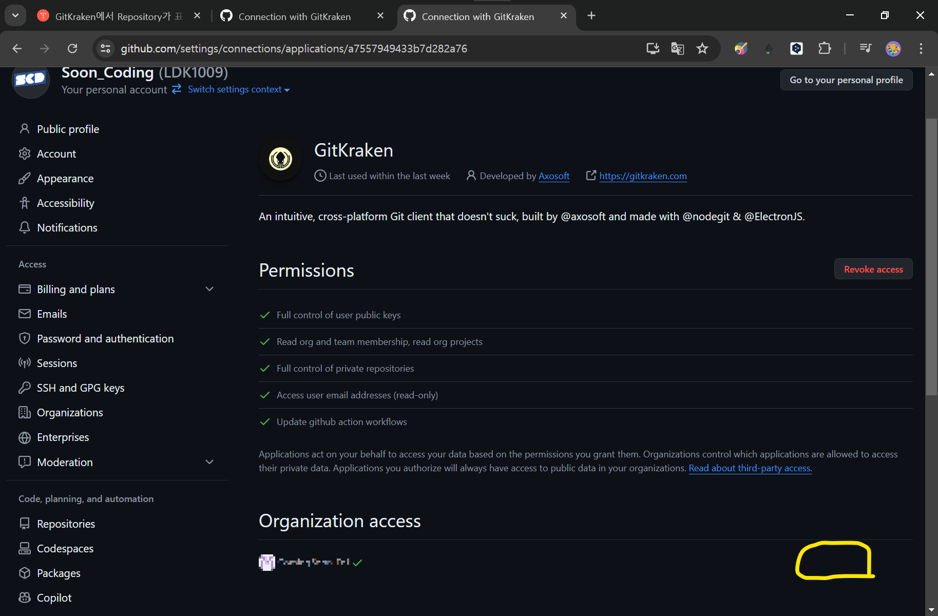 해당 organization에 GitKraken 액세스 권한 요청이 완료되었다.