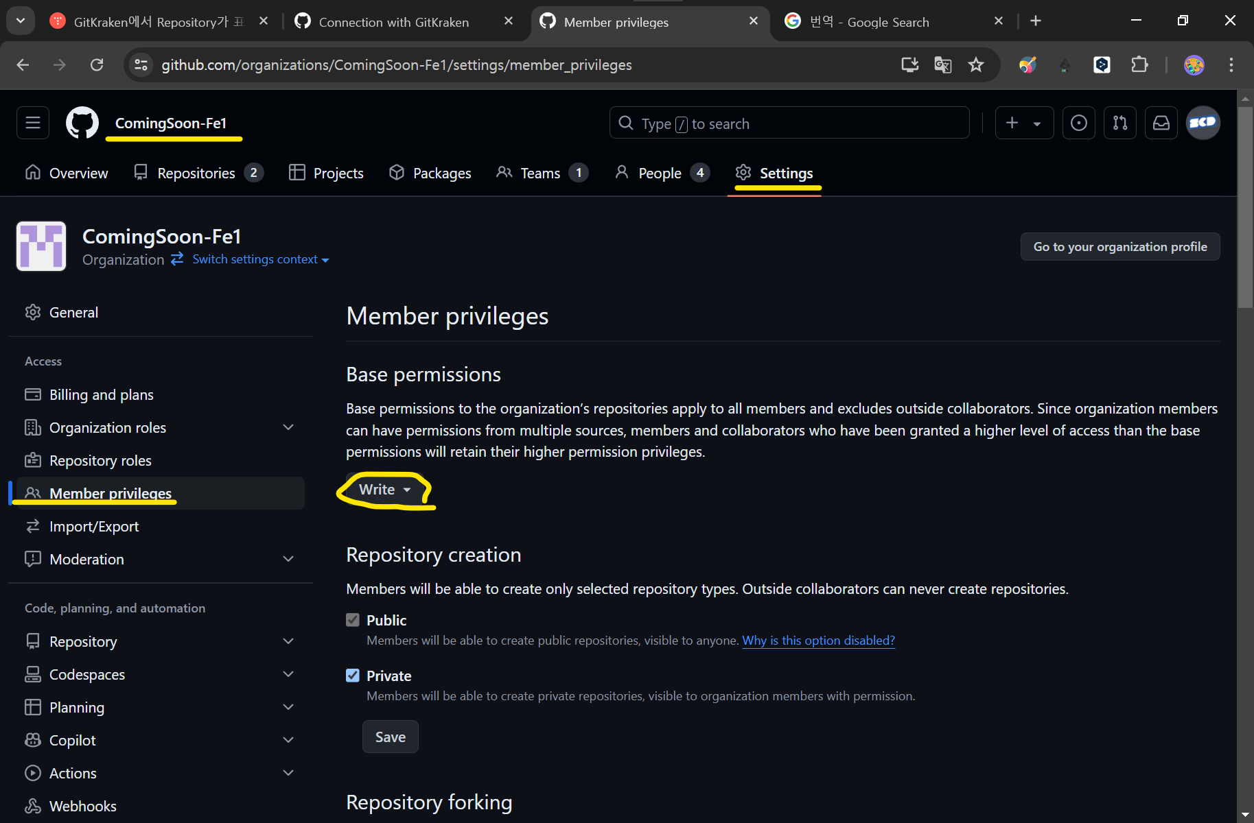 위 과정을 수행해도 오류가 해결이 되지 않는다면 organization 기본 권한 및 멤버 별 권한을 확인해보자