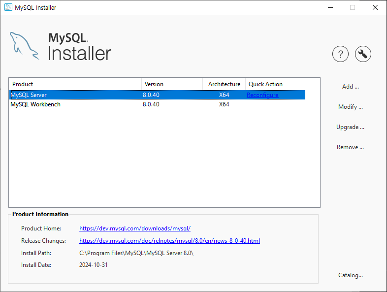 Product Information을 확인해보니 MySQL이 해당 경로에 설치된 것을 확인할 수 있었다.