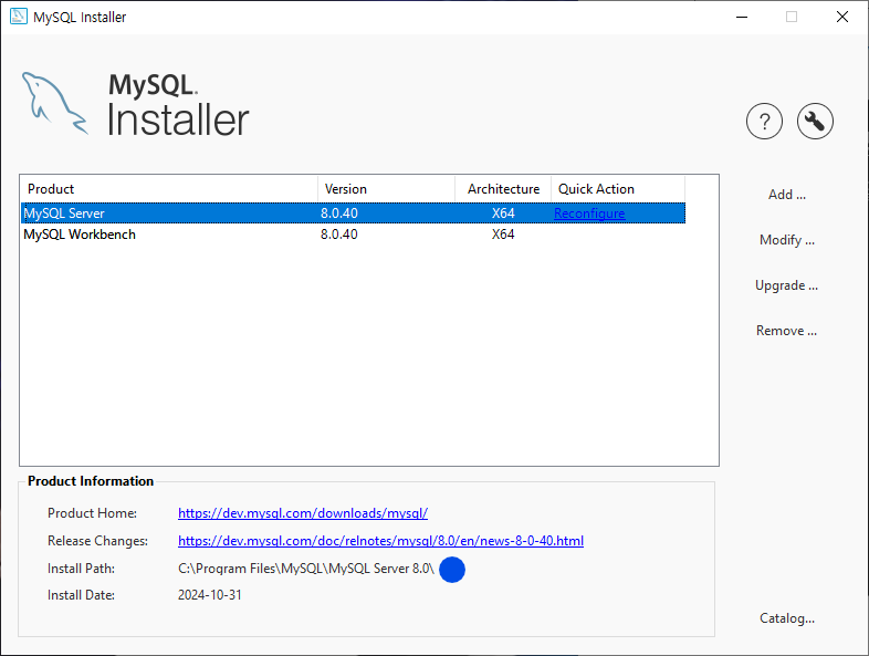 Product Information을 확인해보니 MySQL이 해당 경로에 설치된 것을 확인할 수 있었다.