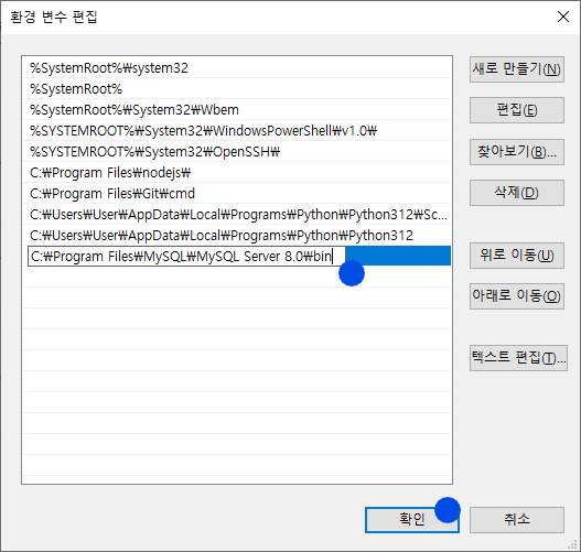 위에서 찾았던 bin 폴더의 경로 복붙 후 확인 클릭
