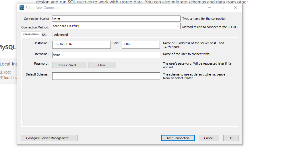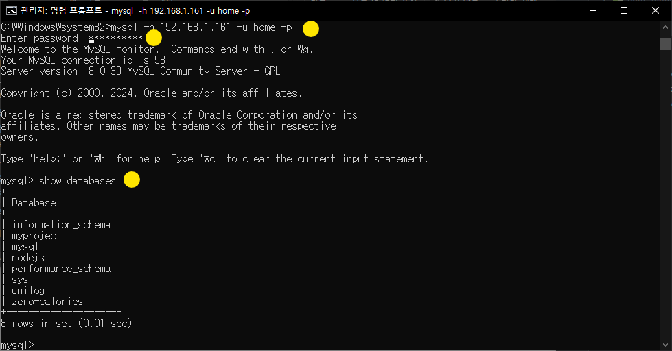 이에 집에 있는 데스크탑 PC로 노트북 MySQL 원격 접속을 시도한다.