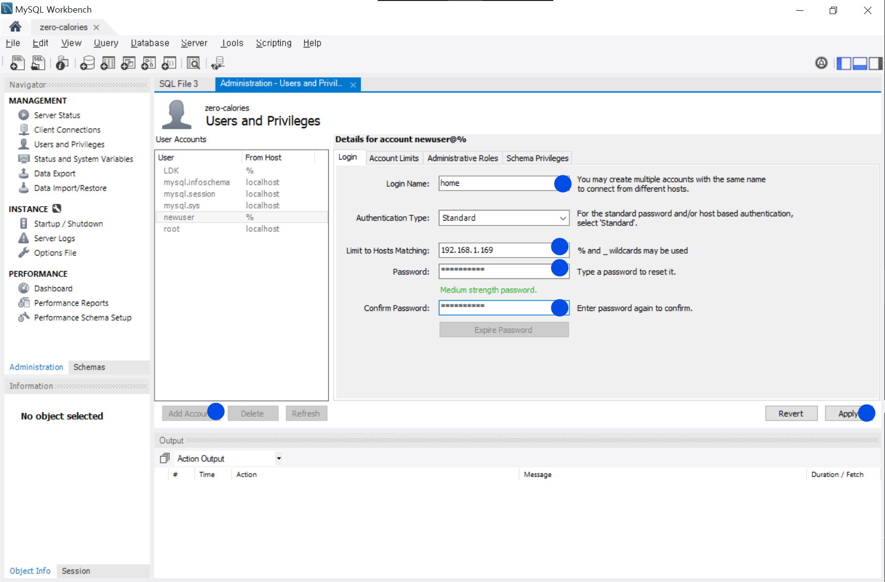 Add Account 클릭 > Login Name, Limit to Hosts Matching, password, Confirm Password 입력 > Apply