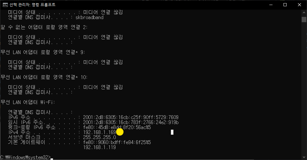 로컬 IP 주소 접속을 허용하기 위해 로컬의 IP를 확인한다.
