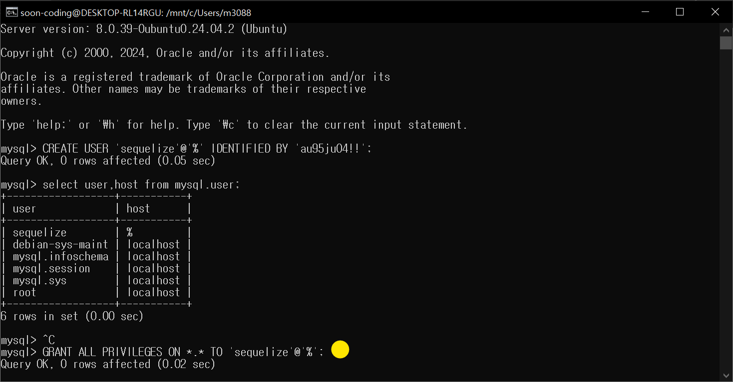 ex ) mysql> CREATE USER 'sequelize'@'%' IDENTIFIED BY '1234qwer!!';