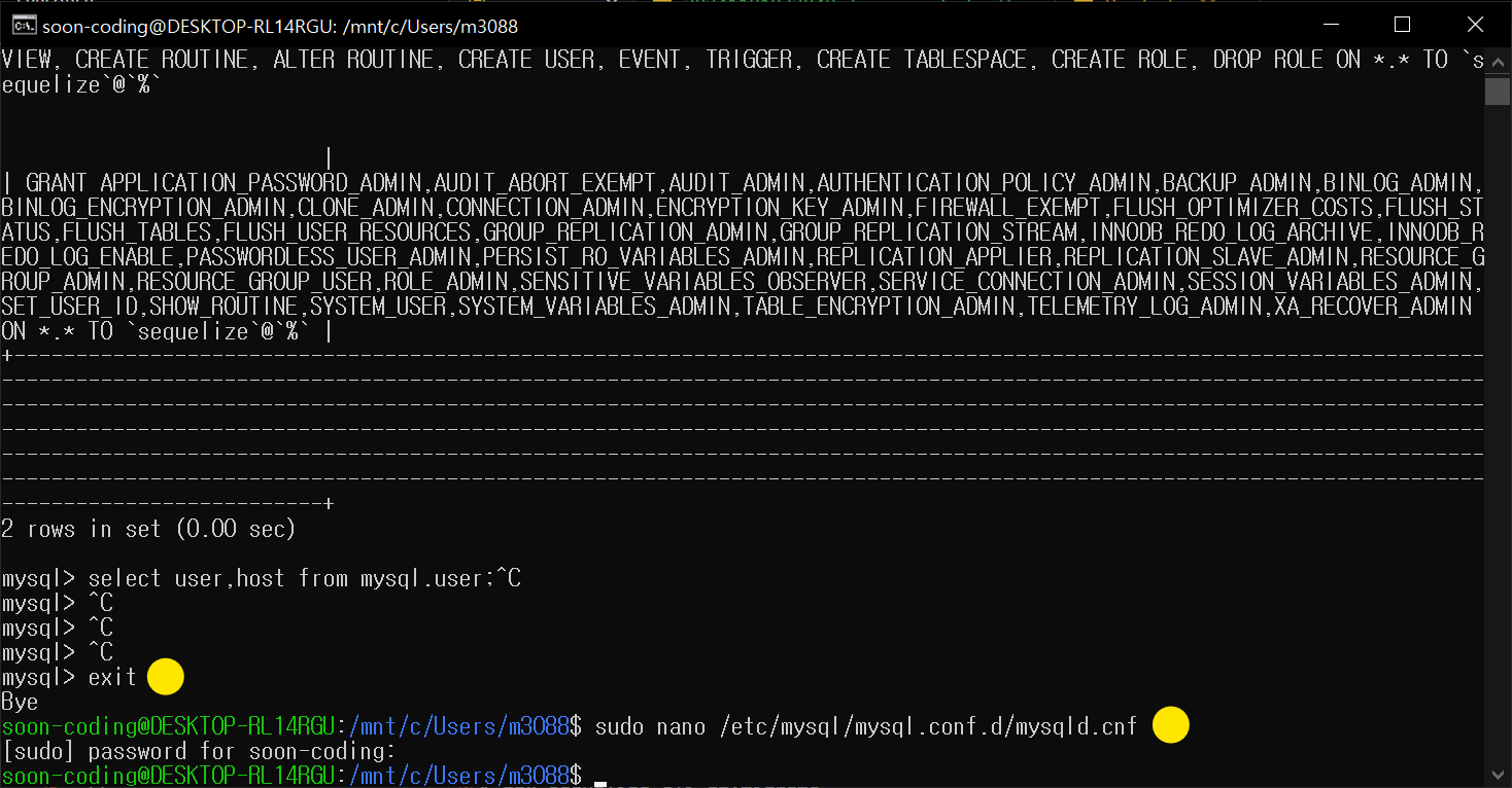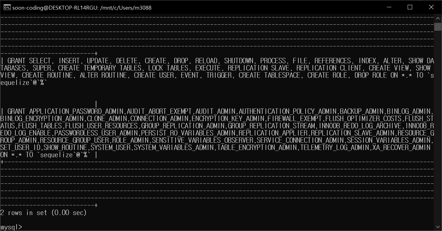 ex2) GRANT ALL PRIVILEGES ON *.* TO 'sequelize'@'%';