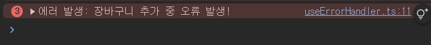 useErrorHandler.ts를 통해 에러 처리 후 의도적으로 장바구니 아이콘 클릭 시 에러를 발생시키자 위와 같이 미리 정의한 에러 메시지가 출력됩니다.