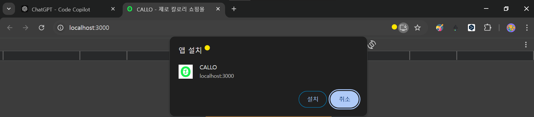 실행 결과 성공적으로 mainfest.json이 전달된 모습과 앱 설치 버튼이 추가된 모습을 확인할 수 있습니다.