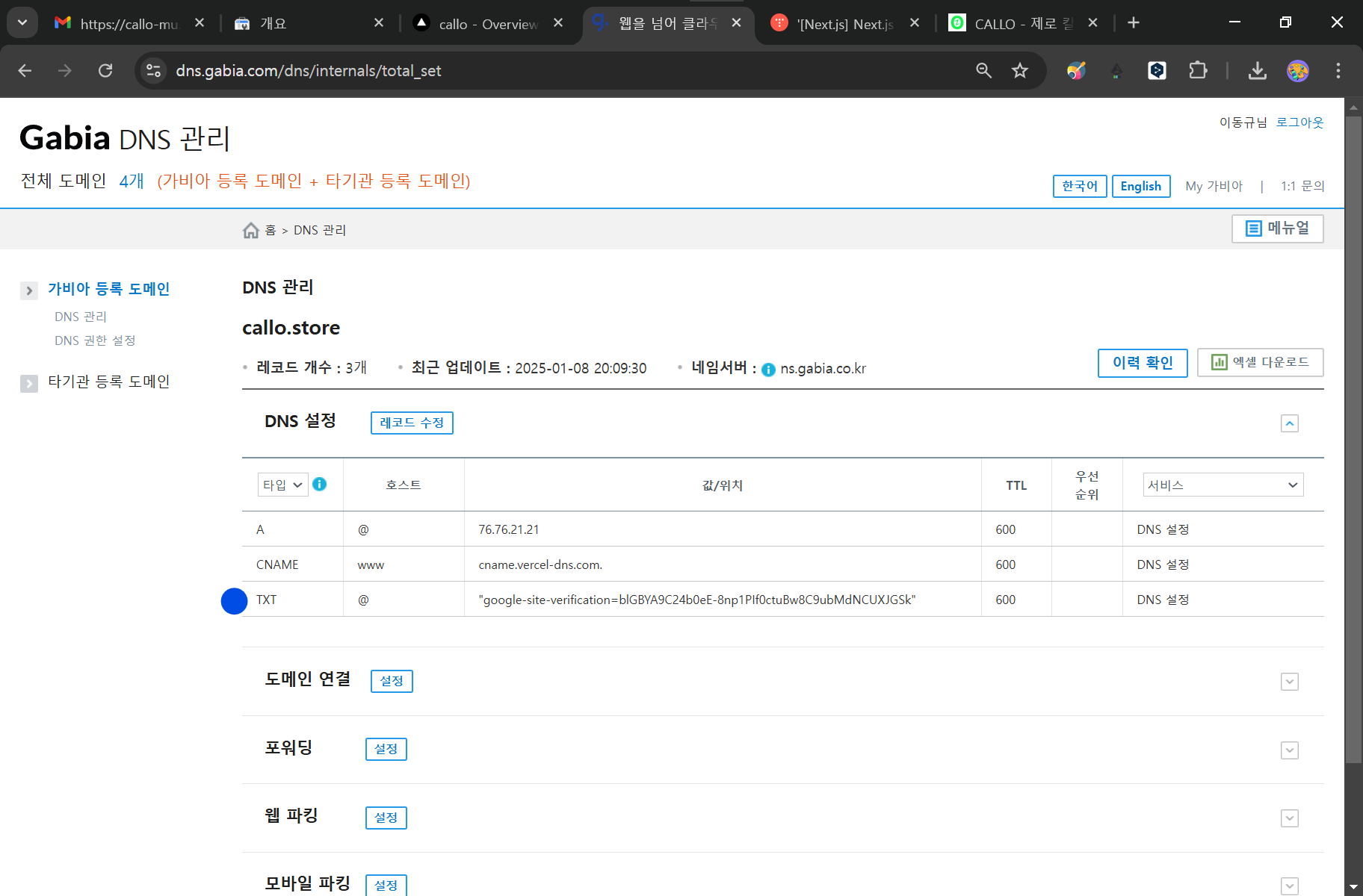 * 기본 배포 도메인이 아닌 구매한 도메인을 입력하여야합니다. ex) 가비아에서 callo.store을 구매했다면 www.callo.store 입력