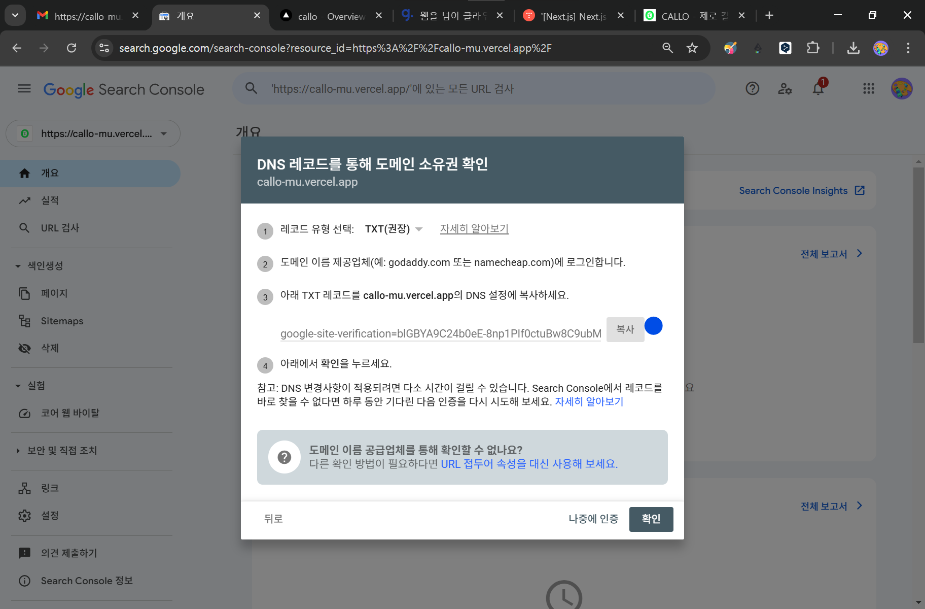 해당 게시물은 Next.js와 Vercel을 통해 웹사이트를 배포한 상황을 가정하여 진행됩니다. 1. 사이트 등록 및 소유확인1) 배포한 웹사이트 URL 복사 https://searchadvisor.naver.com/console/board 네이버네이