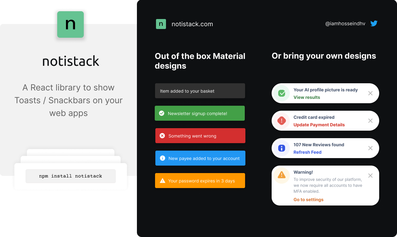 GitHub - iamhosseindhv/notistack: Highly customizable notification snackbars (toasts) that can be stacked on top of each other