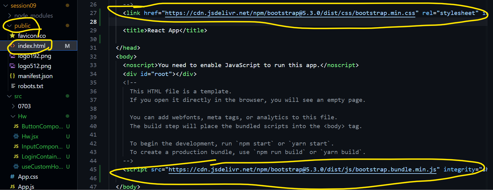 1. public / index.html 에 부트스트랩 시작을 위한 코드를 추가한다
