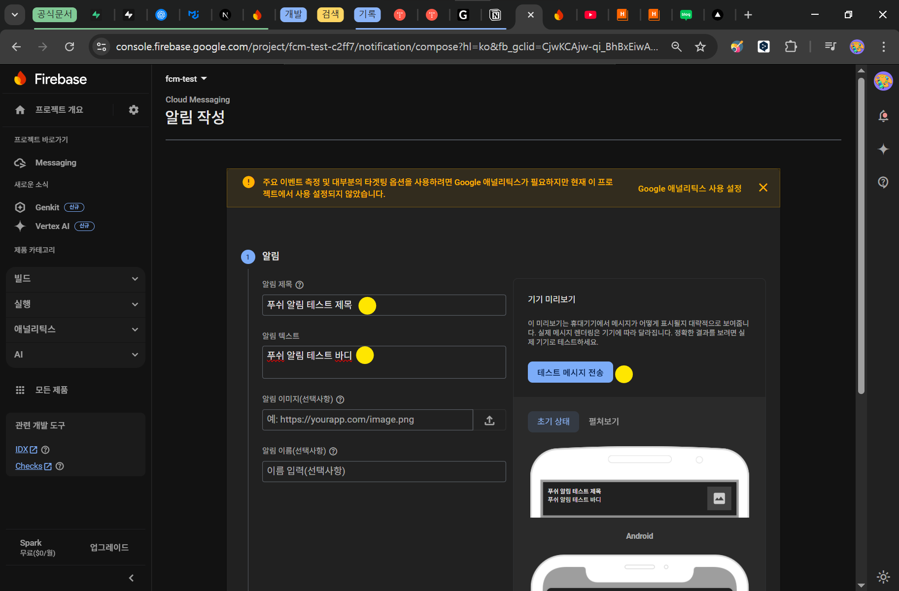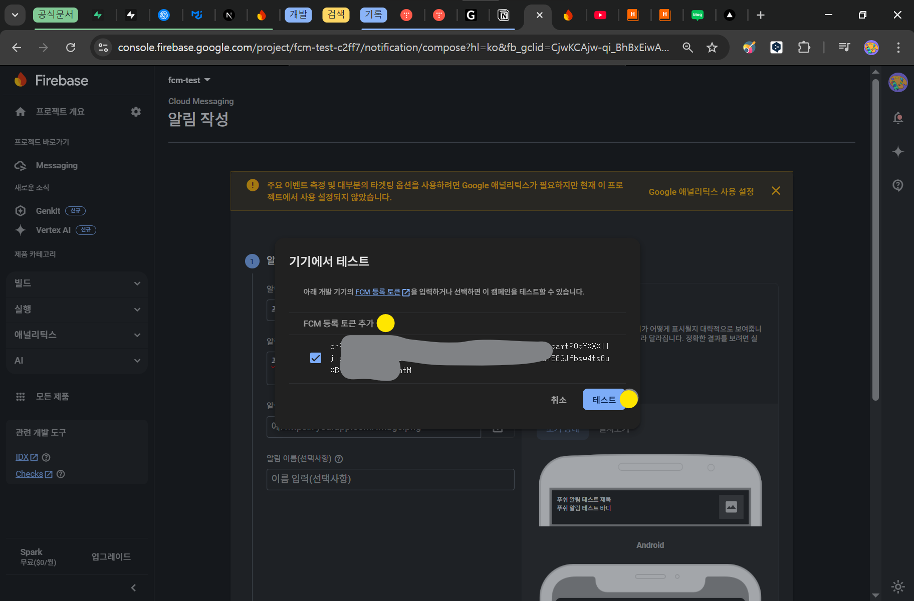 복사했던 FCM 토큰을 등록 및 추가한 후 테스트 버튼을 클릭합니다.