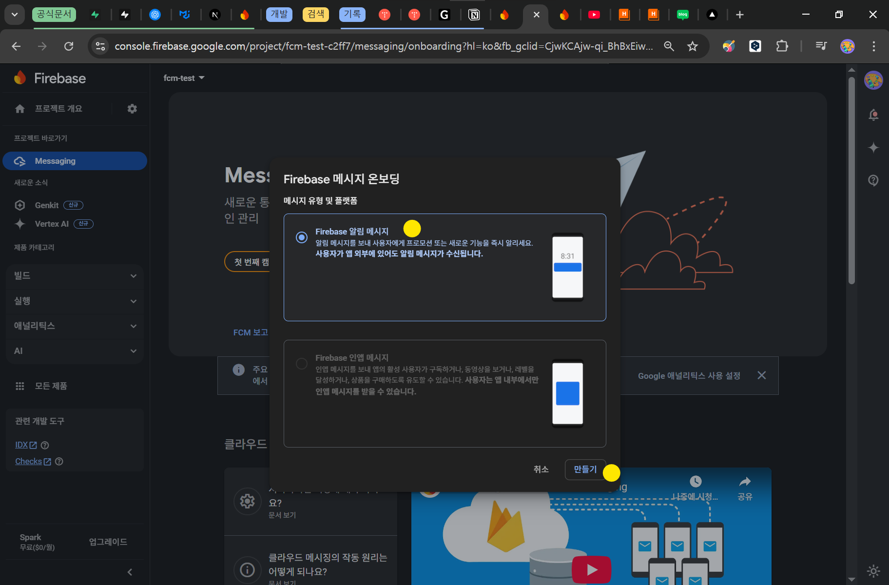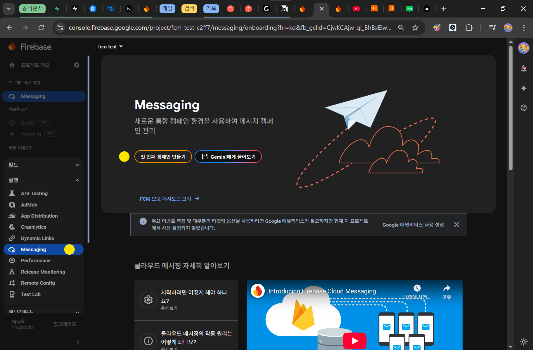 테스트 메시징을 위해 파이어베이스 > 메시징 으로 접속합니다.