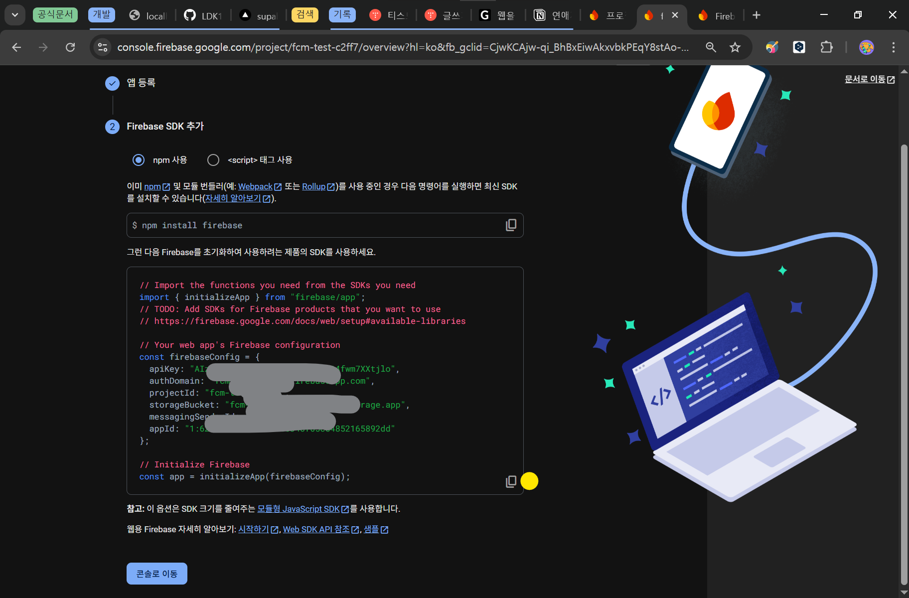 파이어베이스 초기화 코드를 복사합니다.