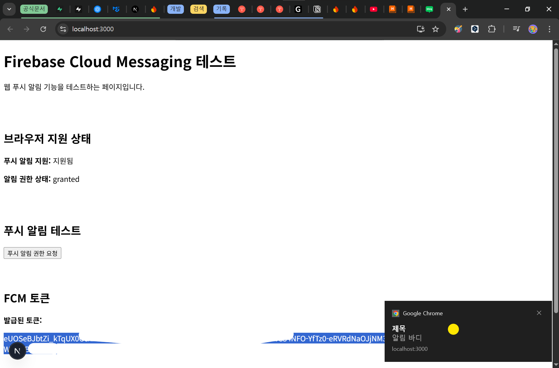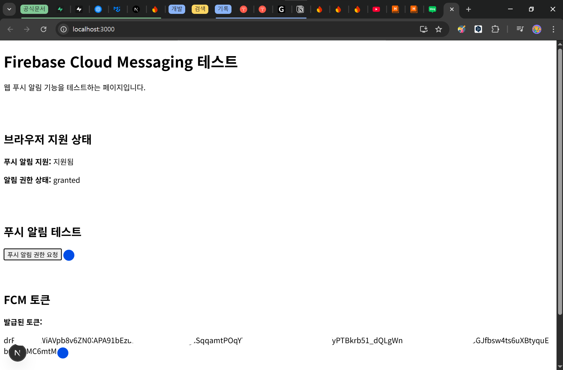 푸쉬 알림 권한 요청 버튼 클릭 후 하단에 발급된 FCM 토큰을 복사합니다.
