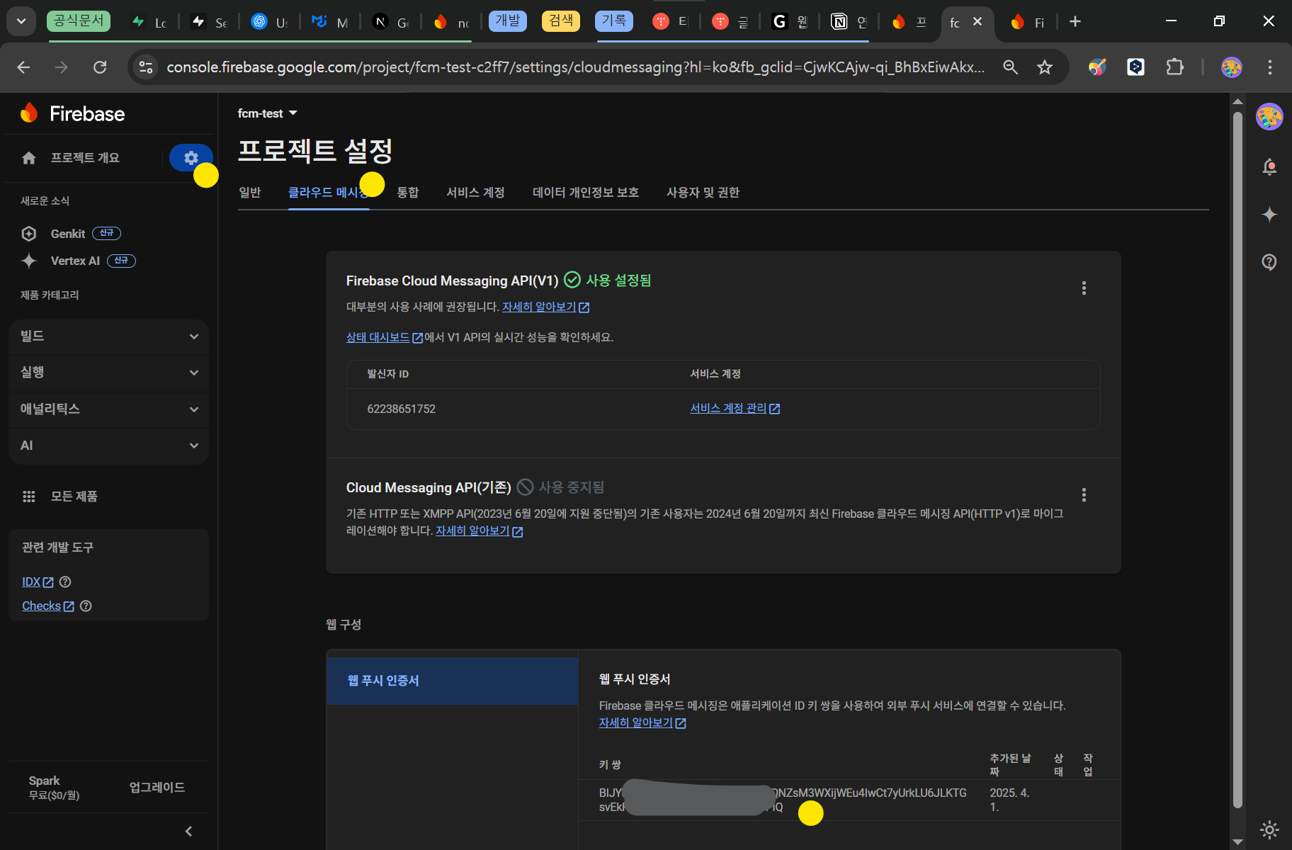 프로젝트 설정 > 클라우드 메시징 > 웹 푸시 인증서