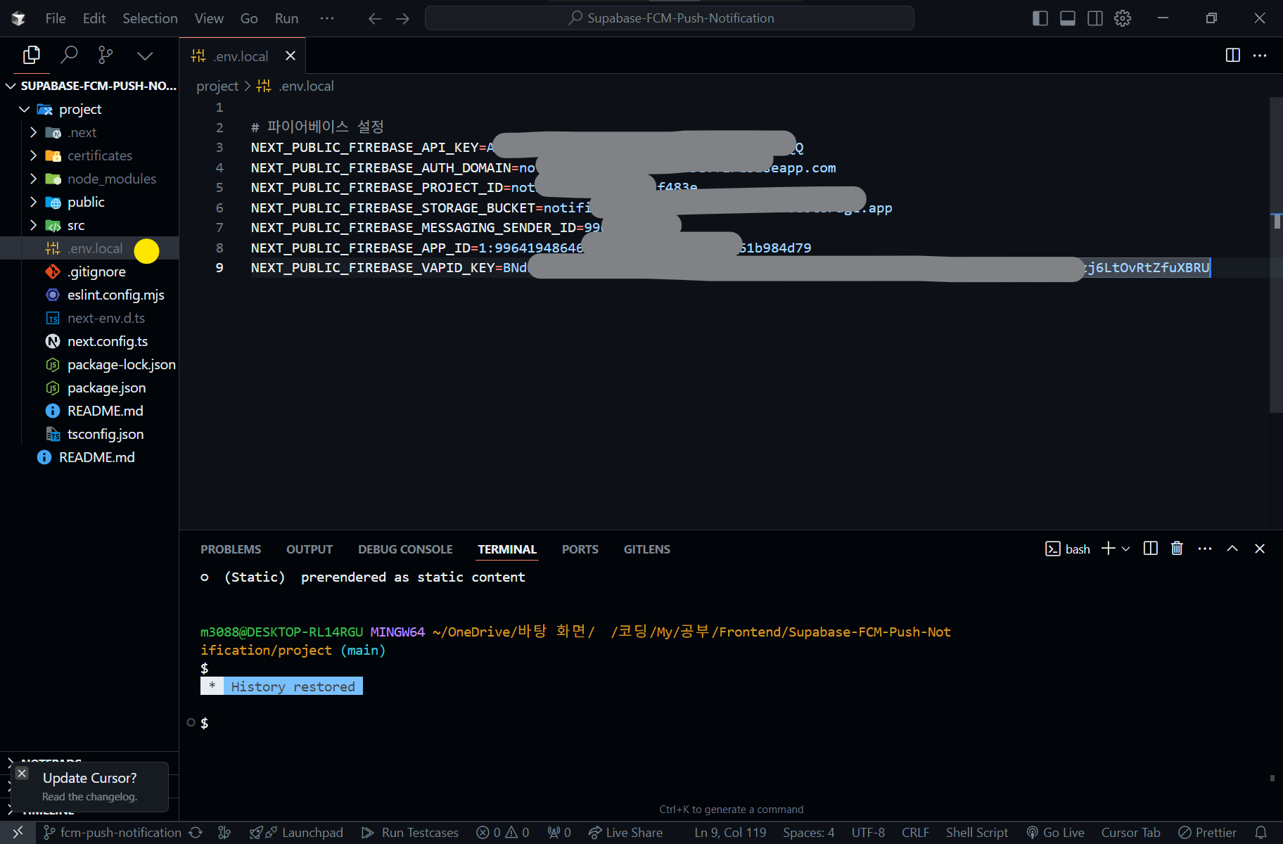 2. .env 환경변수와 파이어베이스 초기화 변수 + 웹 푸쉬 인증서 변수가 일치한 지 검토하세요