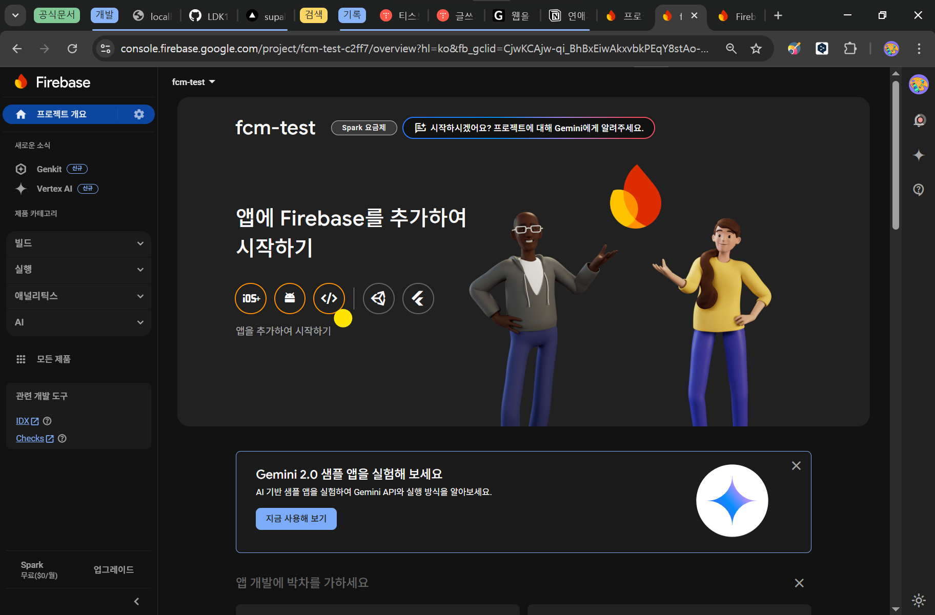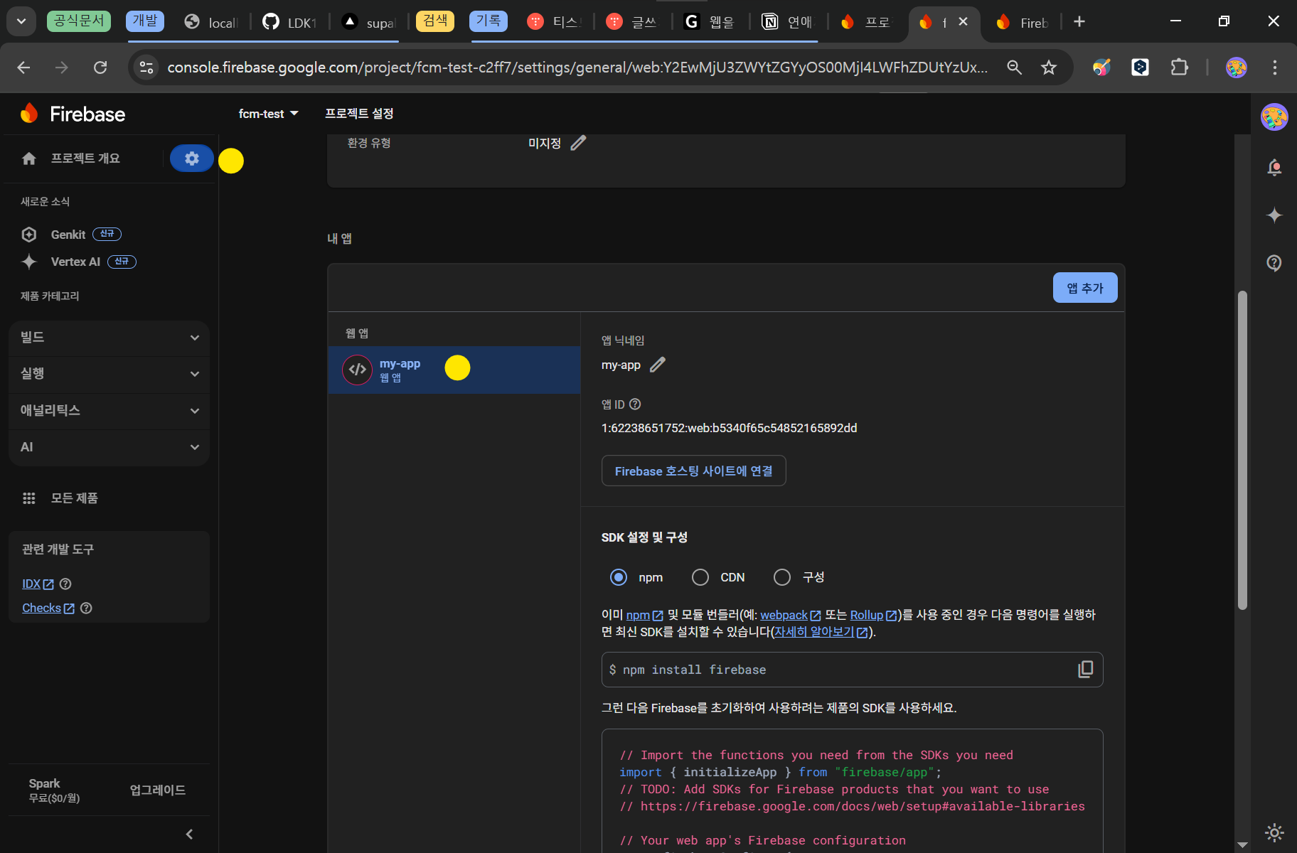 프로젝트 설정에서도 파이어베이스 초기화 코드 확인이 가능합니다.