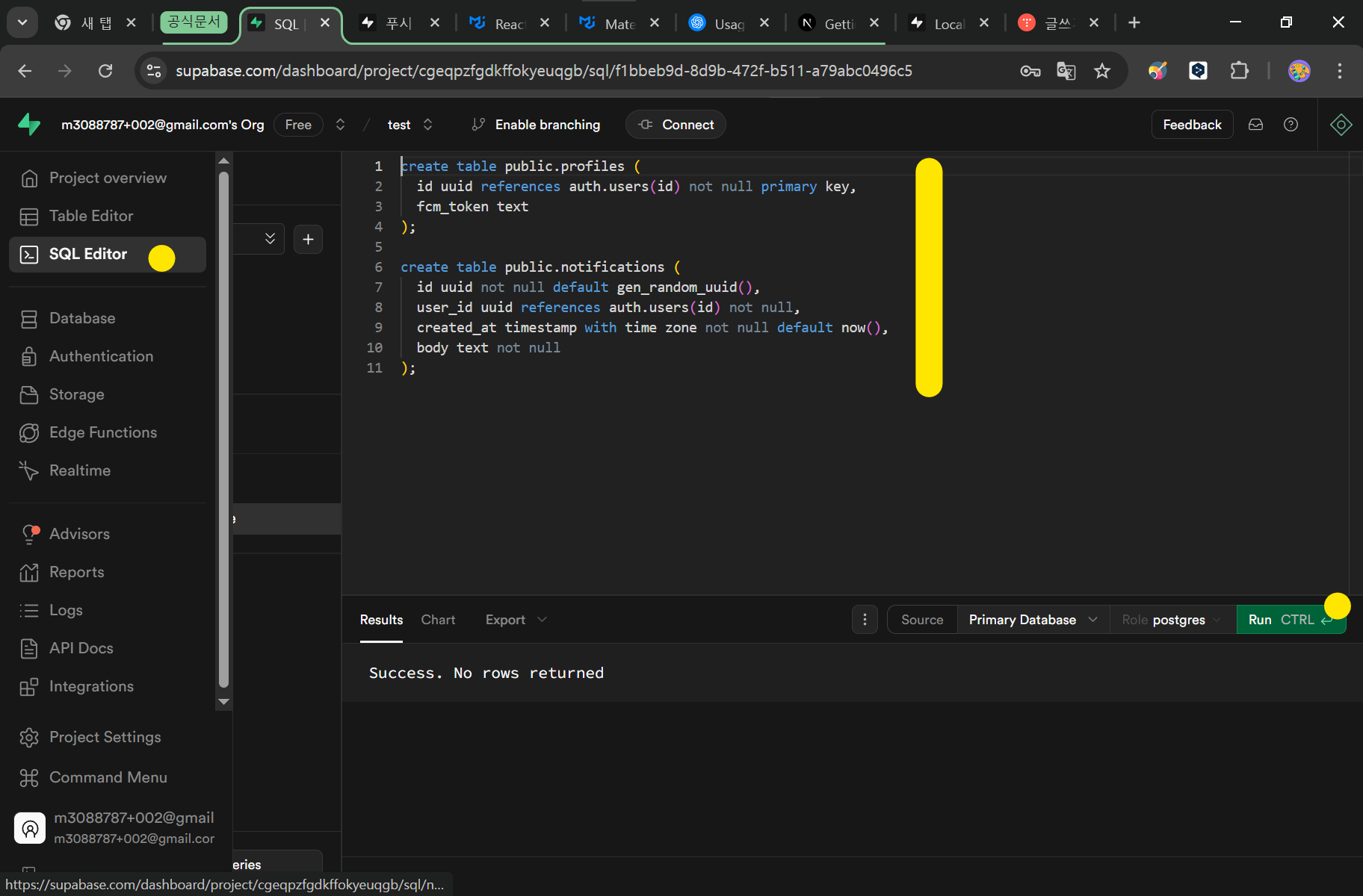 Supabase Dashboard > SQL Editor 에서 위 SQL을 입력합니다.