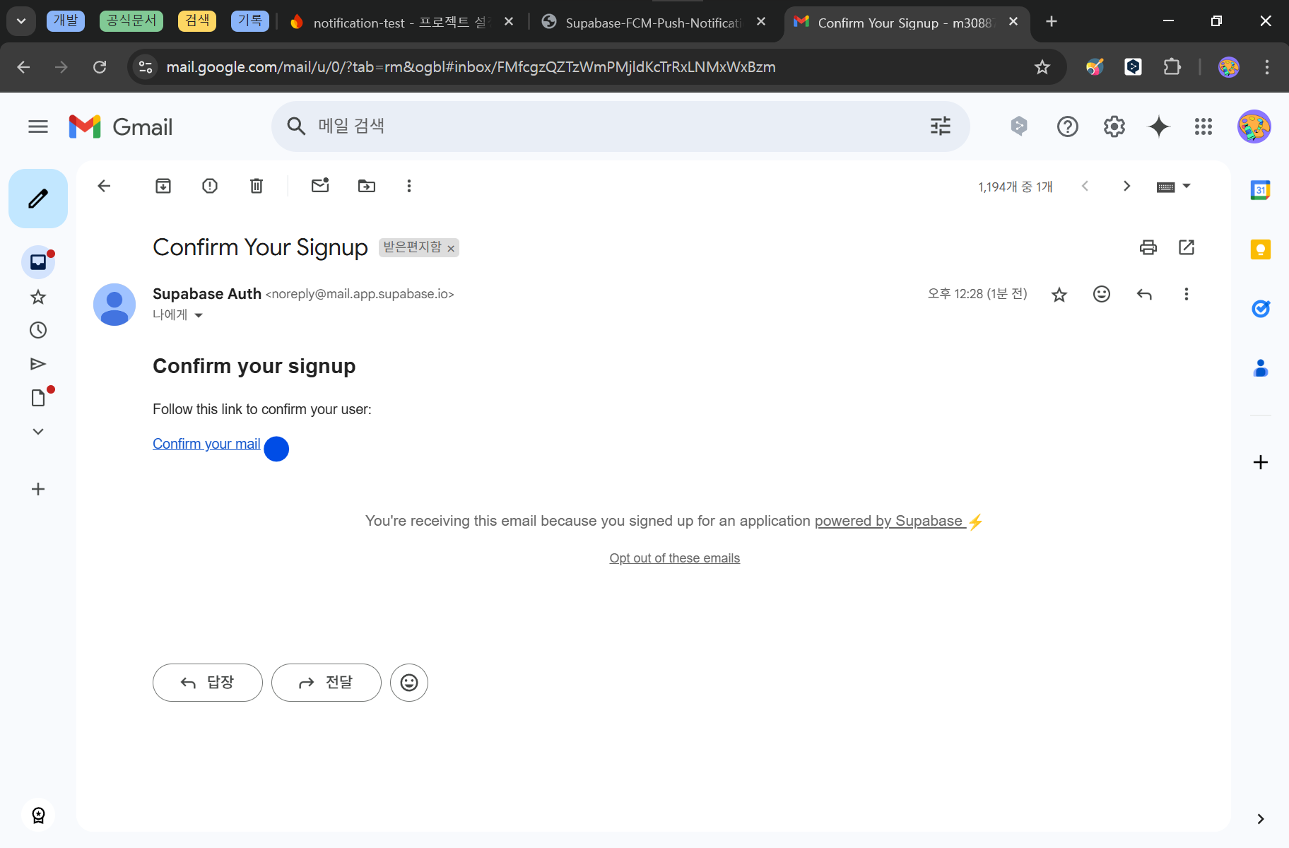 notifications 테이블에 데이터가 INSERT 되었으므로 이전에 설정한 웹훅이 실행되어 push 엣지함수가 실행됩니다.push 엣지함수에서 notifications에 삽입된 데이터를 확인하고 삽입된 데이터의 uid와 일치하는 FCM 토큰 값은 profiles 테이블에서 찾습니다. 이후 해당 FCM 토큰으로 푸쉬 알림을 보냅니다.이 과정을 통해 사용자는 푸쉬 알림을 받습니다.