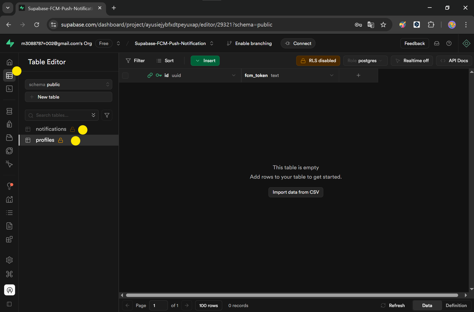 위 버튼 클릭 시 profiles 테이블에 유저의 uid와 기기의 FCM 토큰이 저장됩니다.
