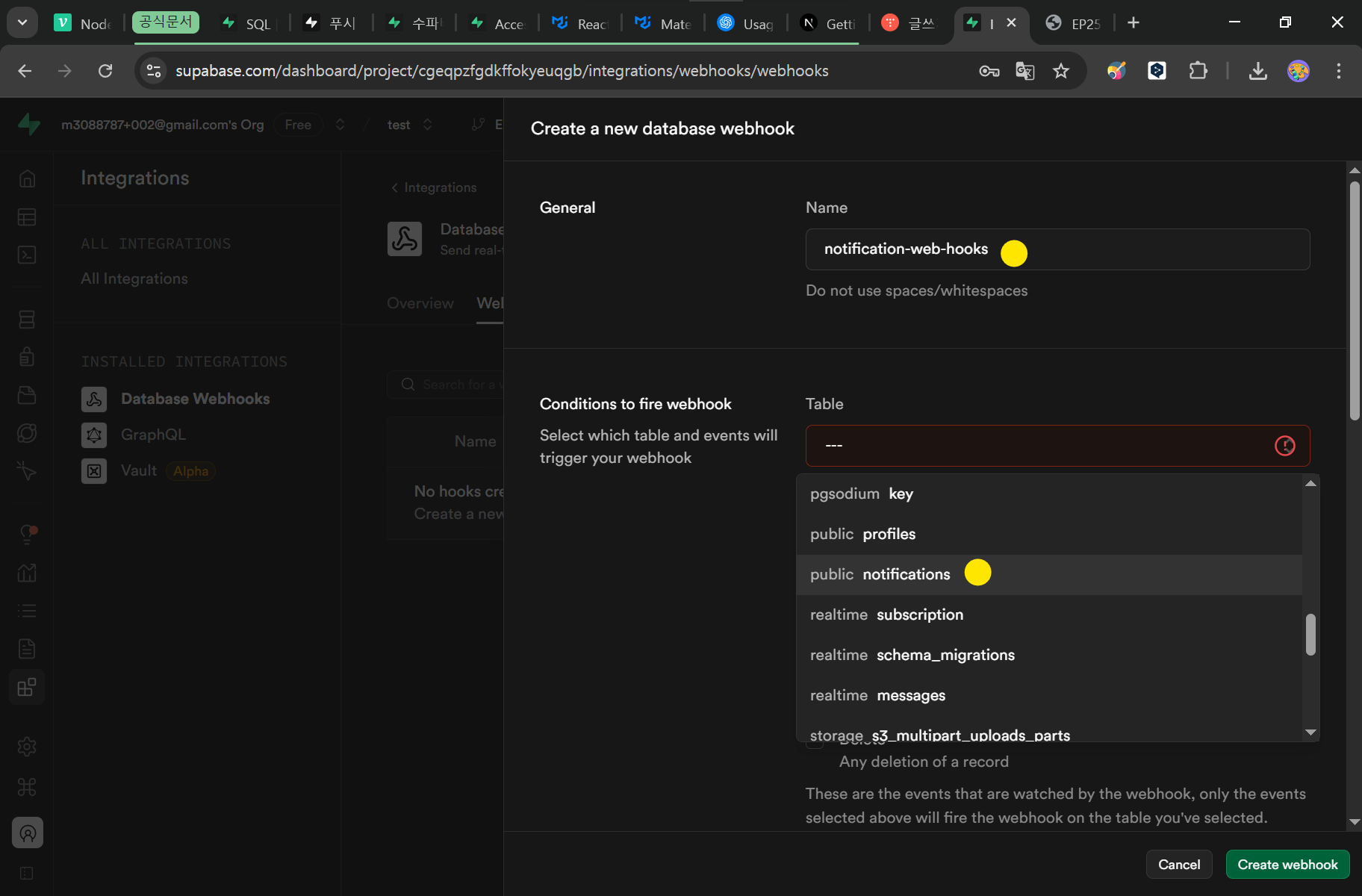Supabase 데이터베이스 웹훅 생성