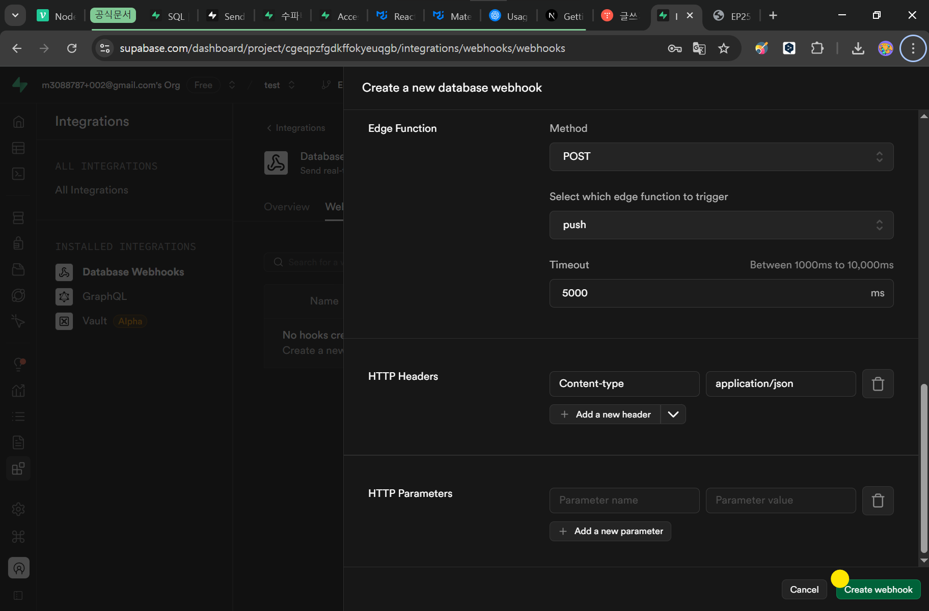 웹훅 구성을 Supabase Edge Functions로 설정합니다.
