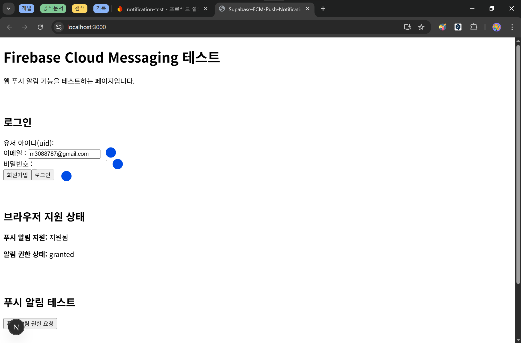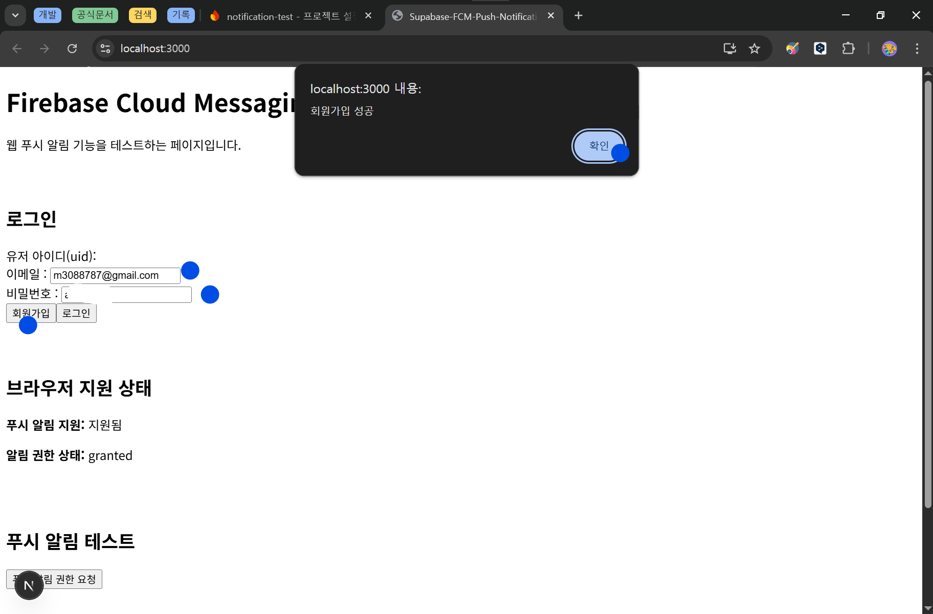 푸쉬 알림 테스트 버튼을 클릭합니다.