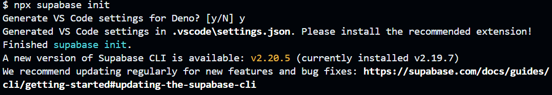 위 명령어는 Supabase 프로젝트에 필요한 기본 폴더 구조와 파일들을 생성합니다.