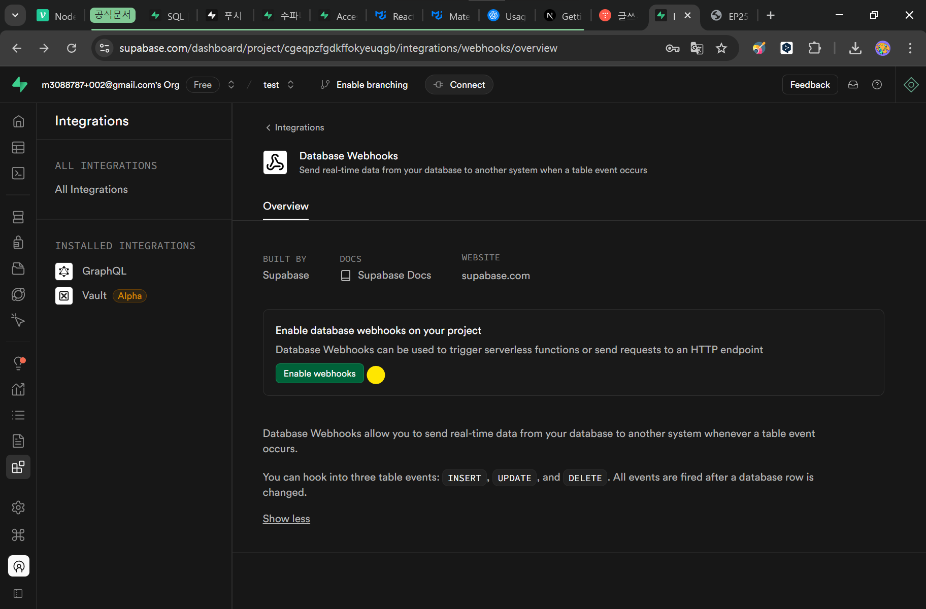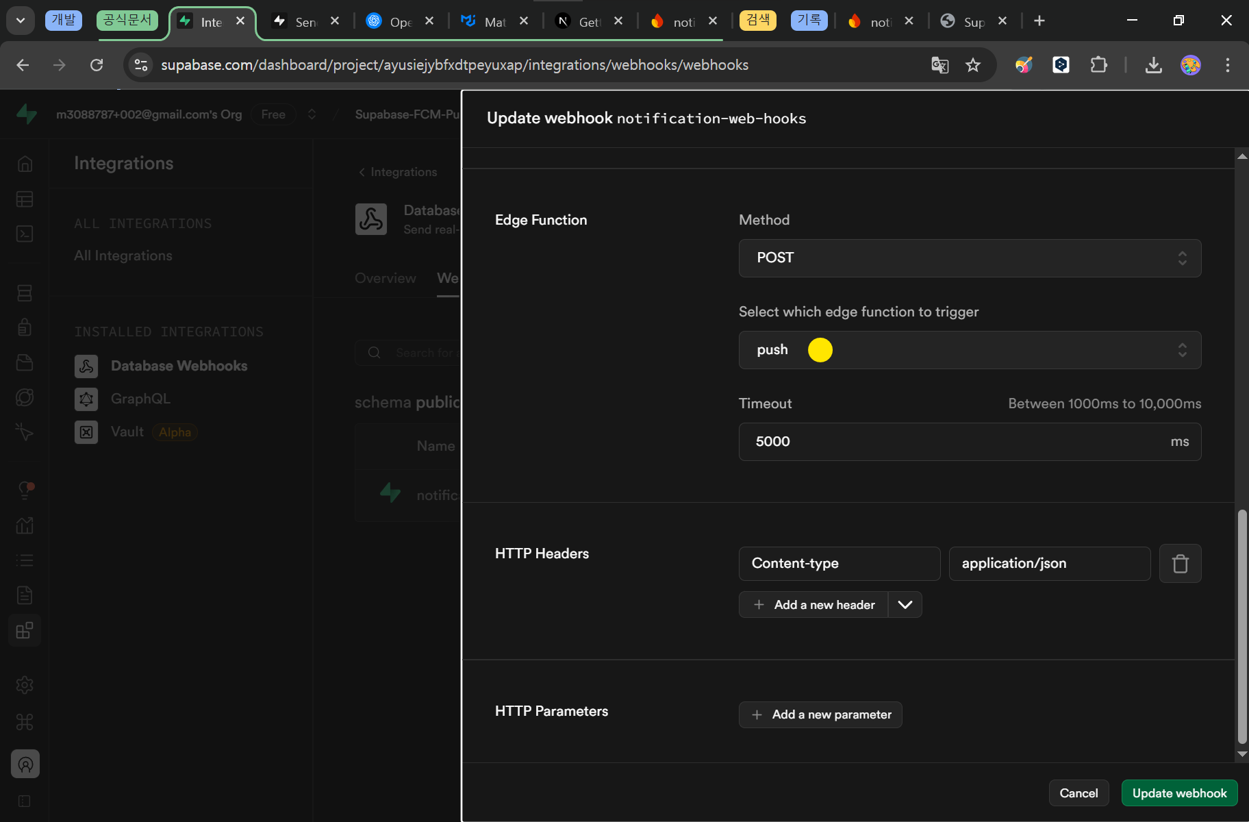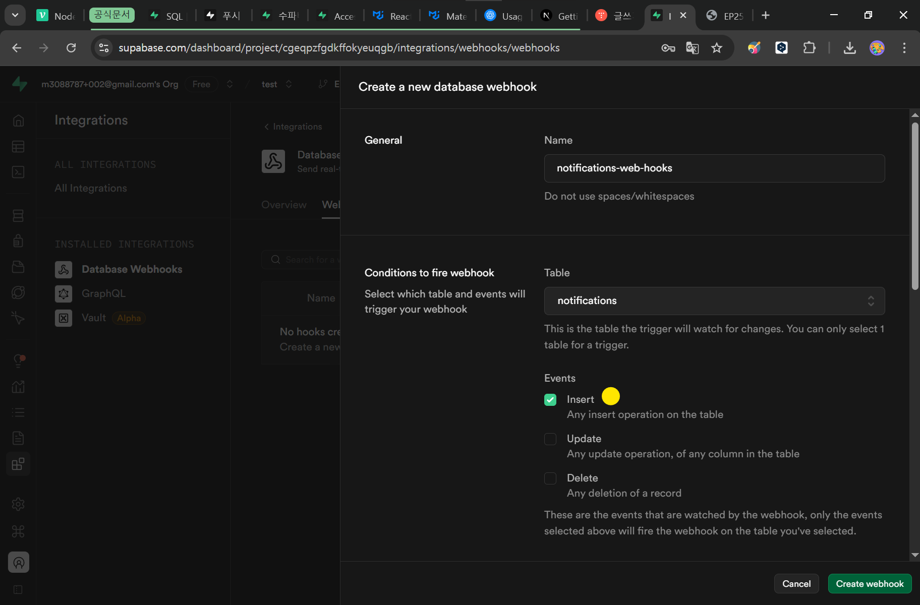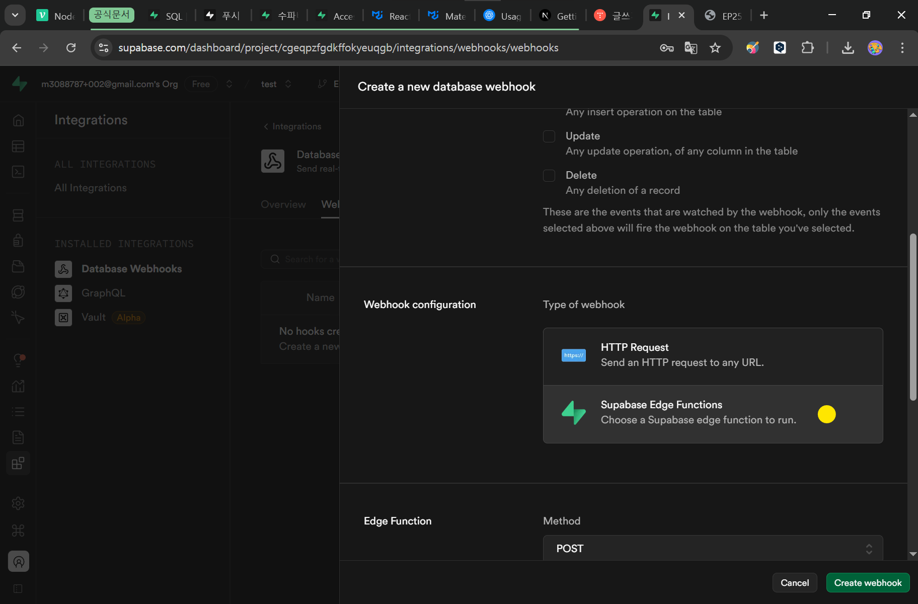 웹훅 구성을 Supabase Edge Functions로 설정합니다.