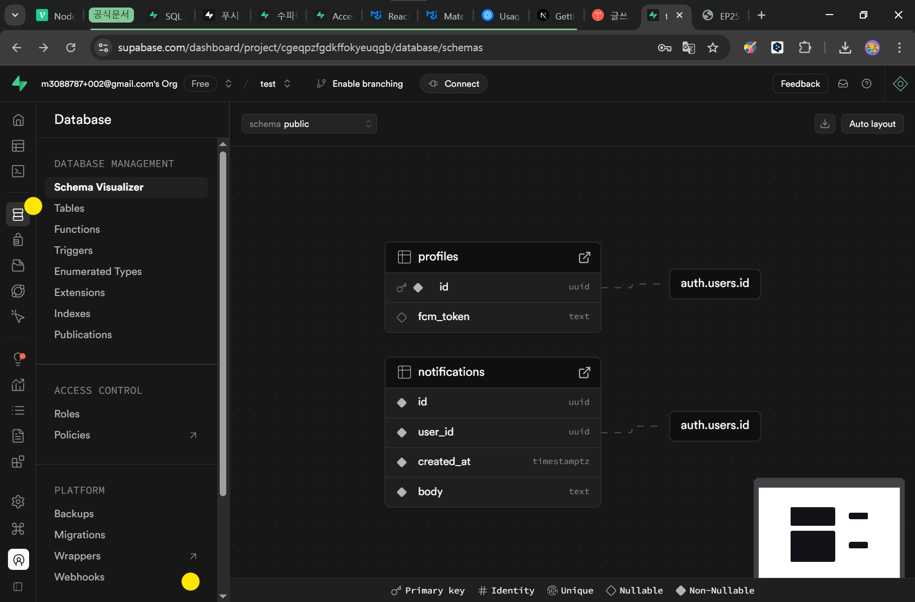 위 버튼 클릭 시 profiles 테이블에 유저의 uid와 기기의 FCM 토큰이 저장됩니다.