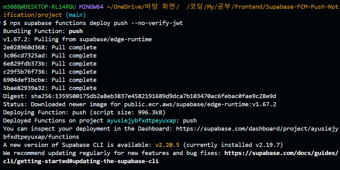 이 명령어는 'push'라는 이름의 서버리스 함수를 Supabase 클라우드에 배포합니다.
