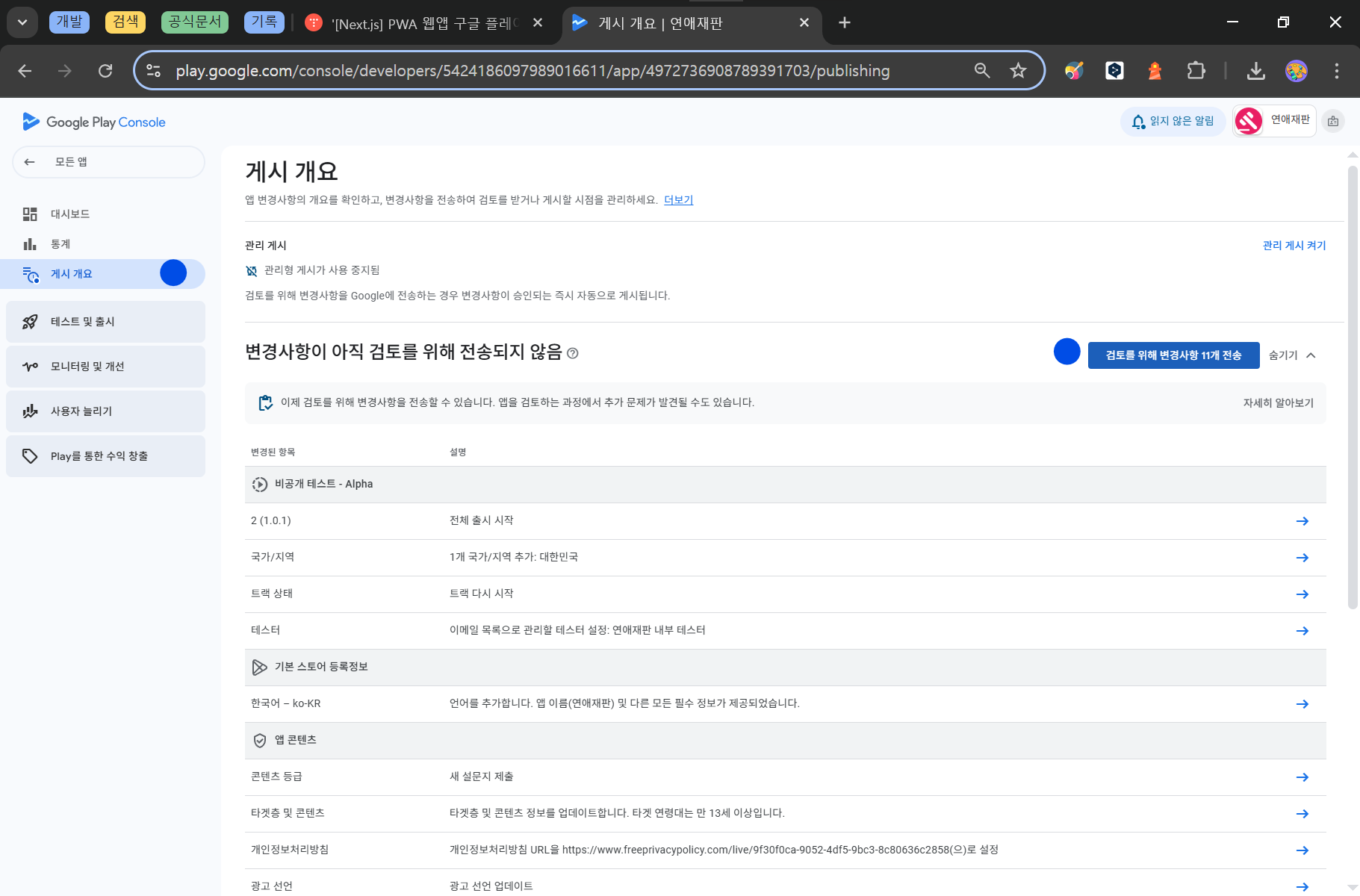 작년 11월부터 새로생긴 정책으로 인해 안드로이드 플레이스토어 출시가 굉장히 까다로워졌다. 개인 개발자들의 신규 계정에 대해 프로덕션 출시 이전 20명을 모아 비공개 테스트를 진행해야