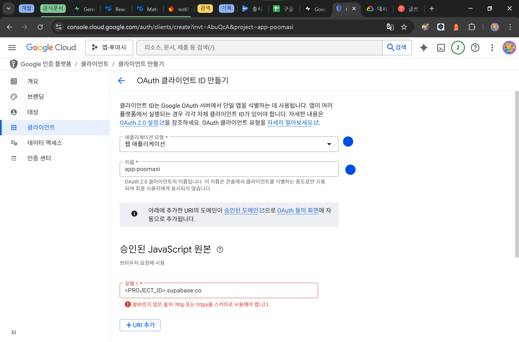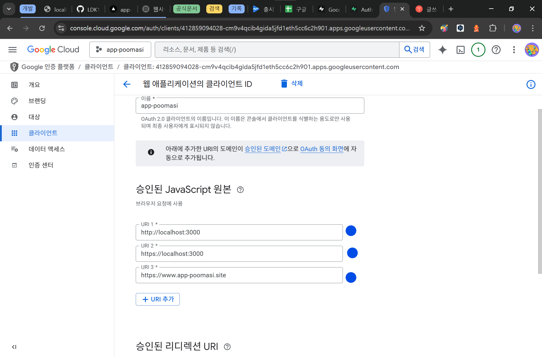 필자는 개발 서버(localhost)와 배포 URL(www.app-.poomasi.site)을 입력하였습니다. (테스트를 위해 localhost를 추가함)