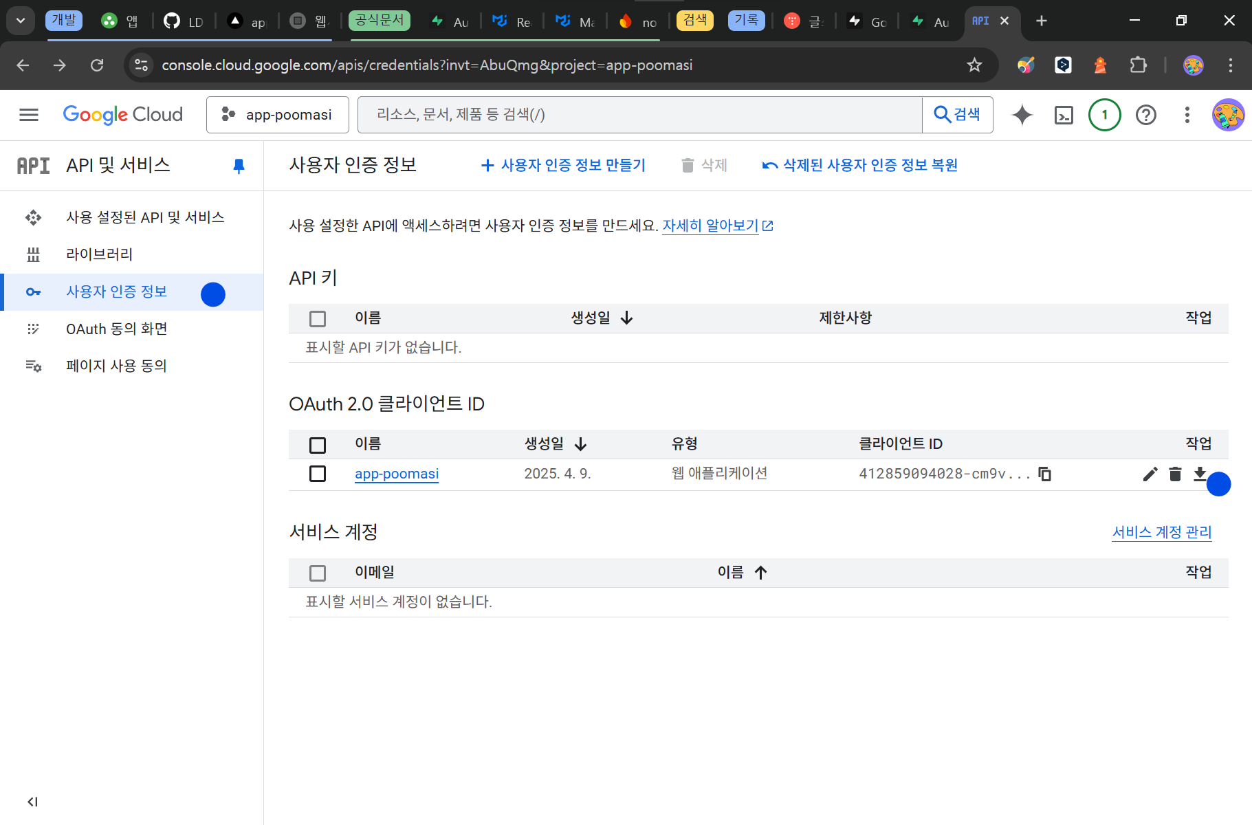 사용자 인증 정보로 이동 후 이전에 생성한 클라이언트 ID 우측 다운로드 아이콘을 클릭합니다.