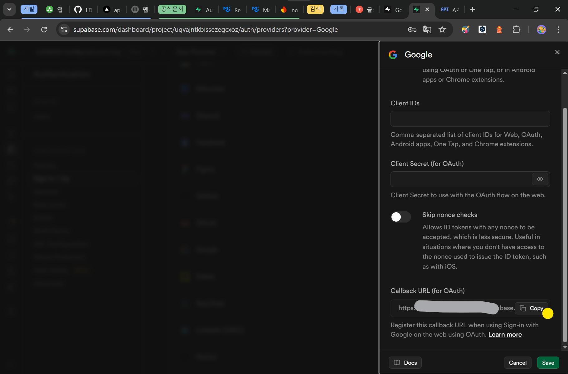 Supabase에서 구글 로그인의 Callback URL을 복사합니다.