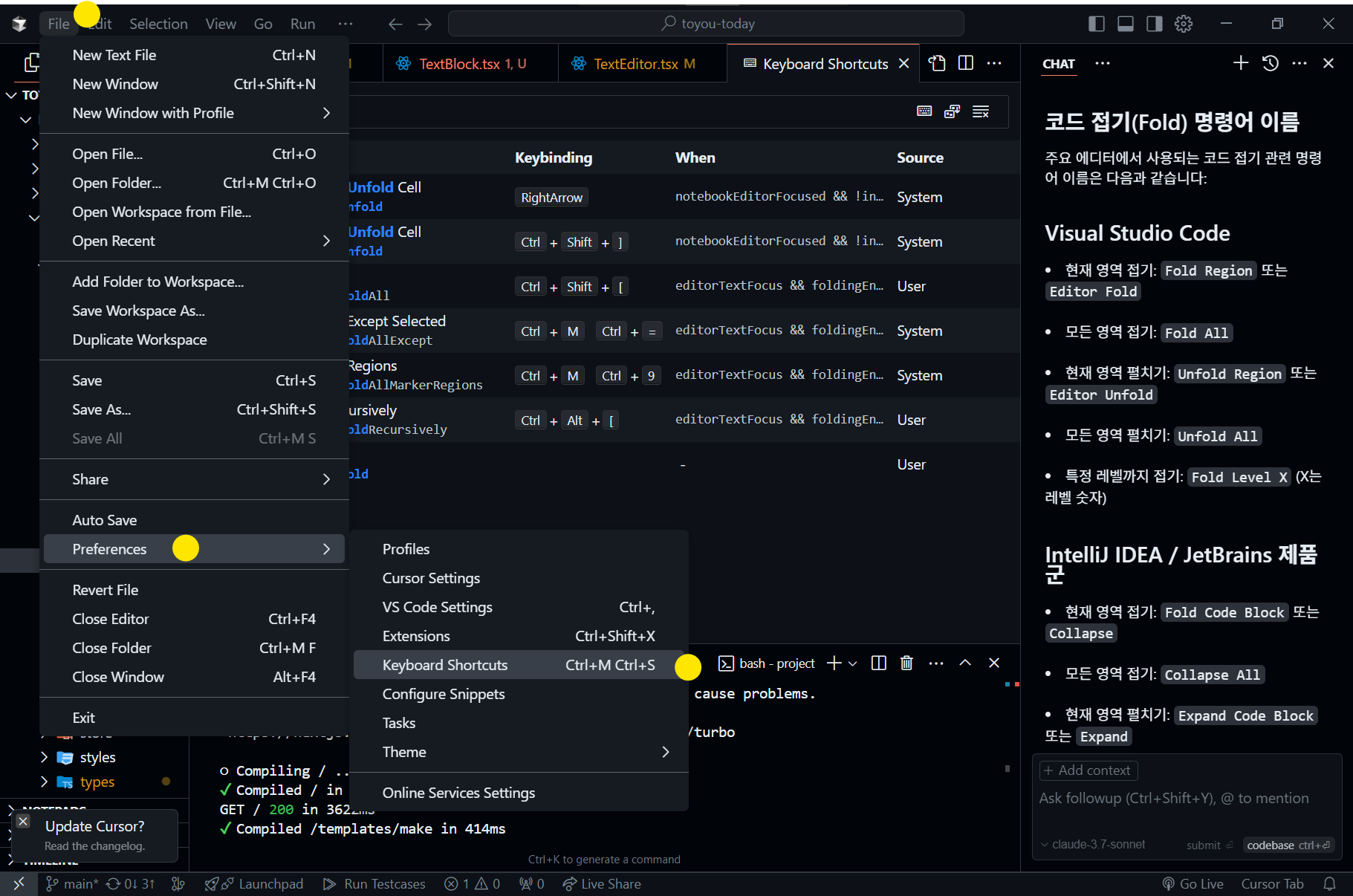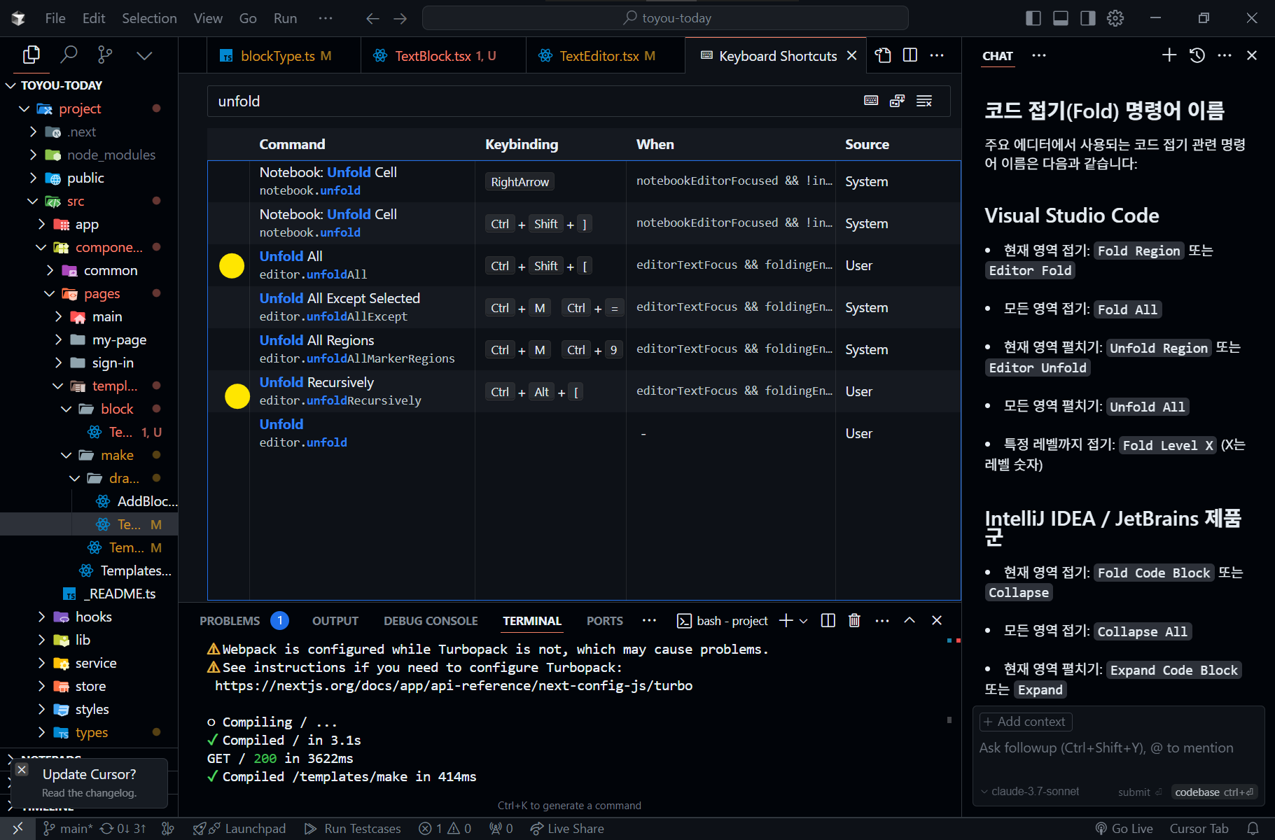 Unfold All = 모든 코드 접기 단축키Unfold Recursively = 선택한 영역 코드 접기 단축키Fold All = 모든 코드 펼치기 단축키Fold Recursively = 선택한 영역 코드 펼치기 단축키 원하는 단축키로 변경 후 Cursor를 재실행하면 정상적으로 단축키가 동작합니다. 공유하기 게시글 관리 순코딩 저작자표시 비영리 동일조건 (새창열림)