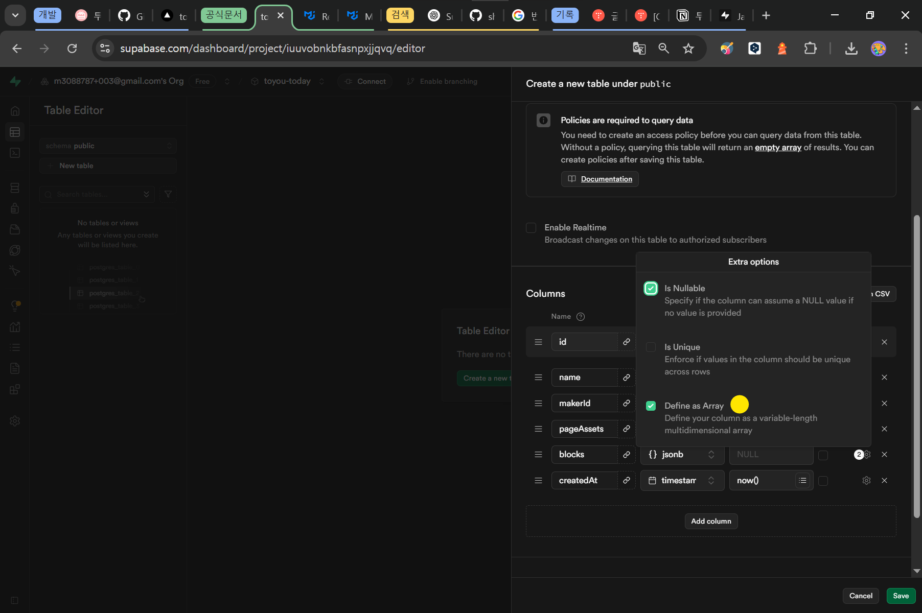 1. 컬럼 타입을 jsonb로 설정합니다.