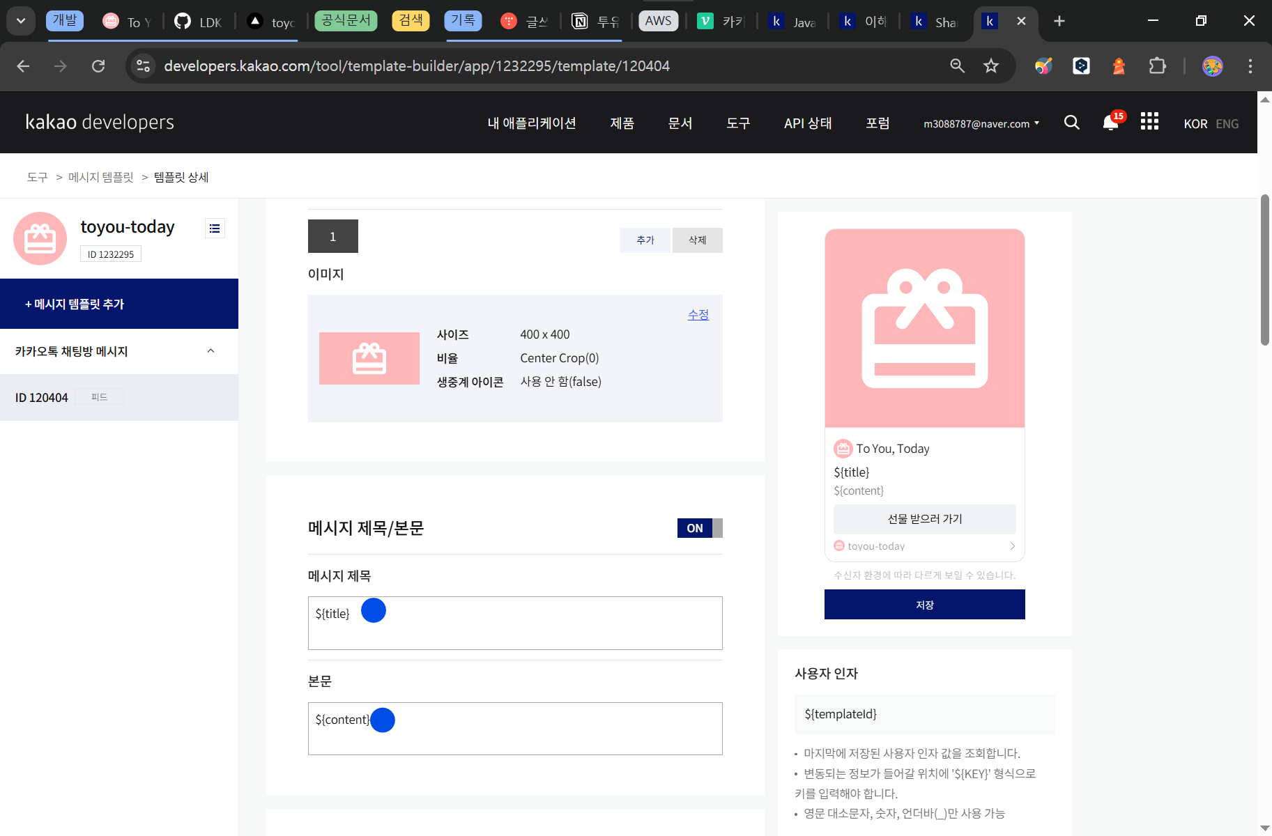 이에 제목과 본문란에 텍스트가 아닌 ${title}과 ${content} 변수를 입력했습니다.