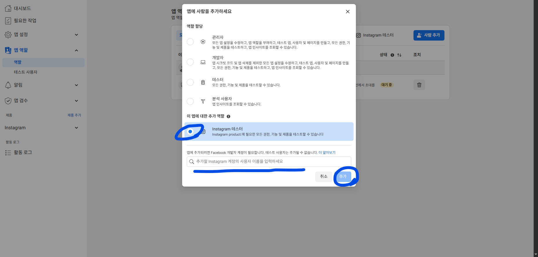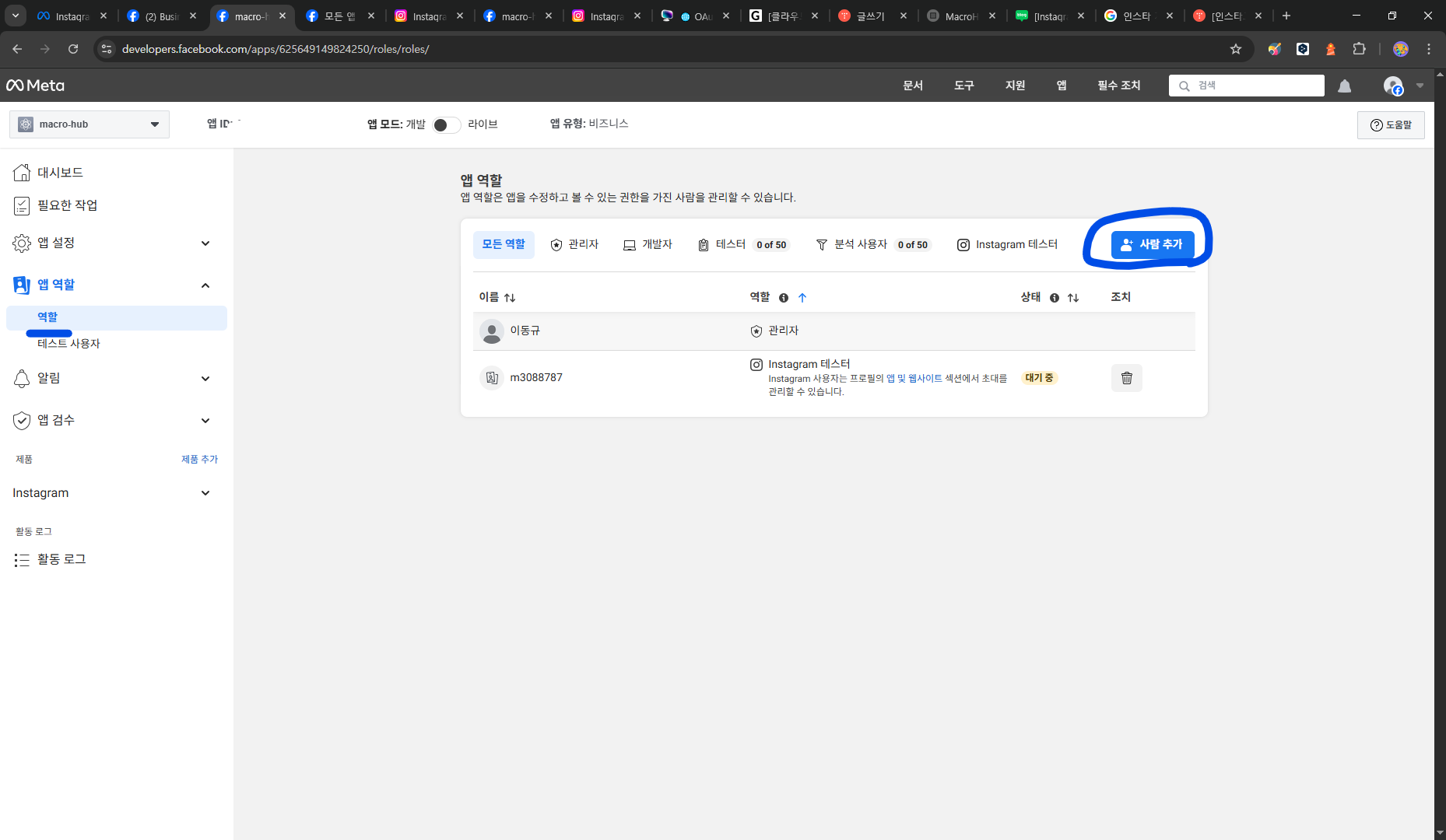테스트 계정으로 등록할 인스타그램 계정 닉네임으로 검색 후 추가