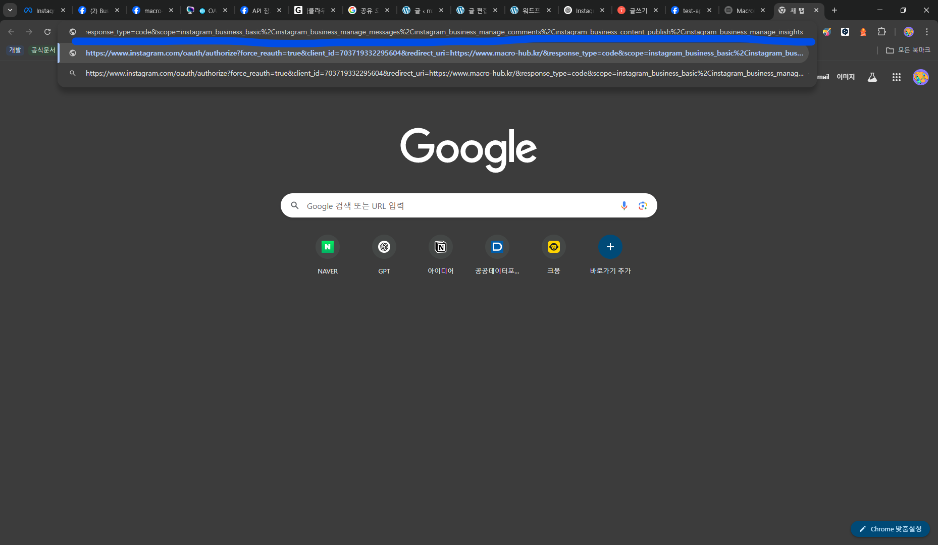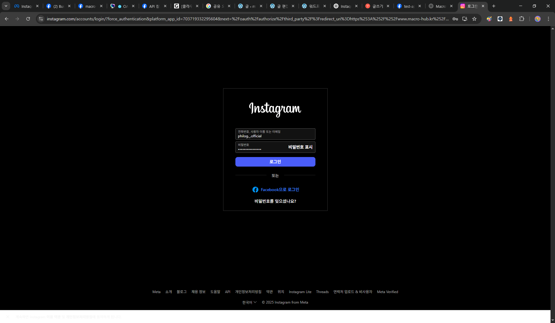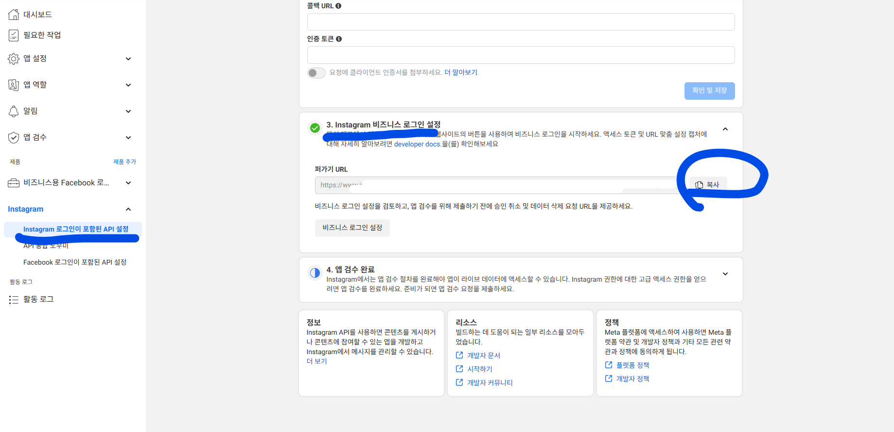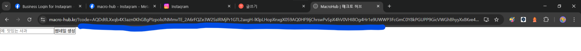 필자는 인스타그램 로그인을 구현할 서비스의 URL을 입력함