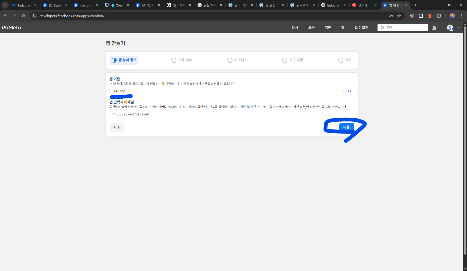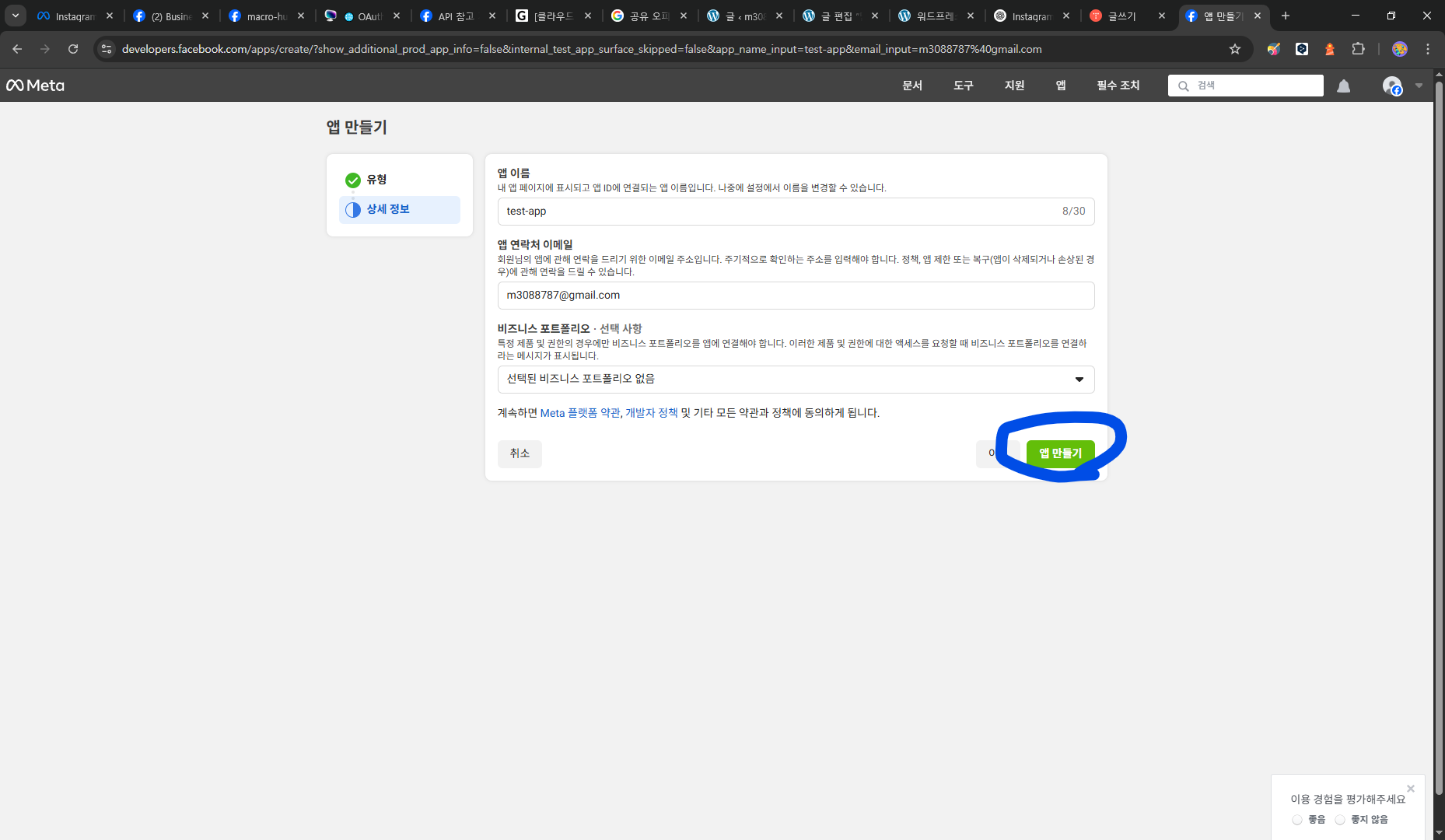 앱 정보 확인 후 '앱 만들기' 클릭