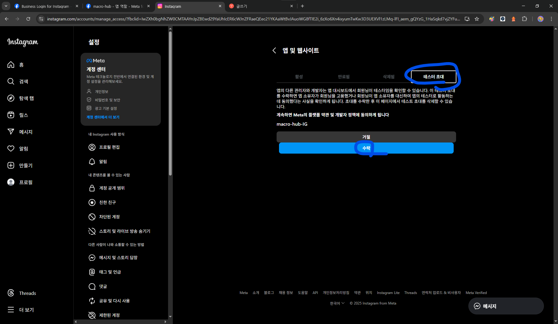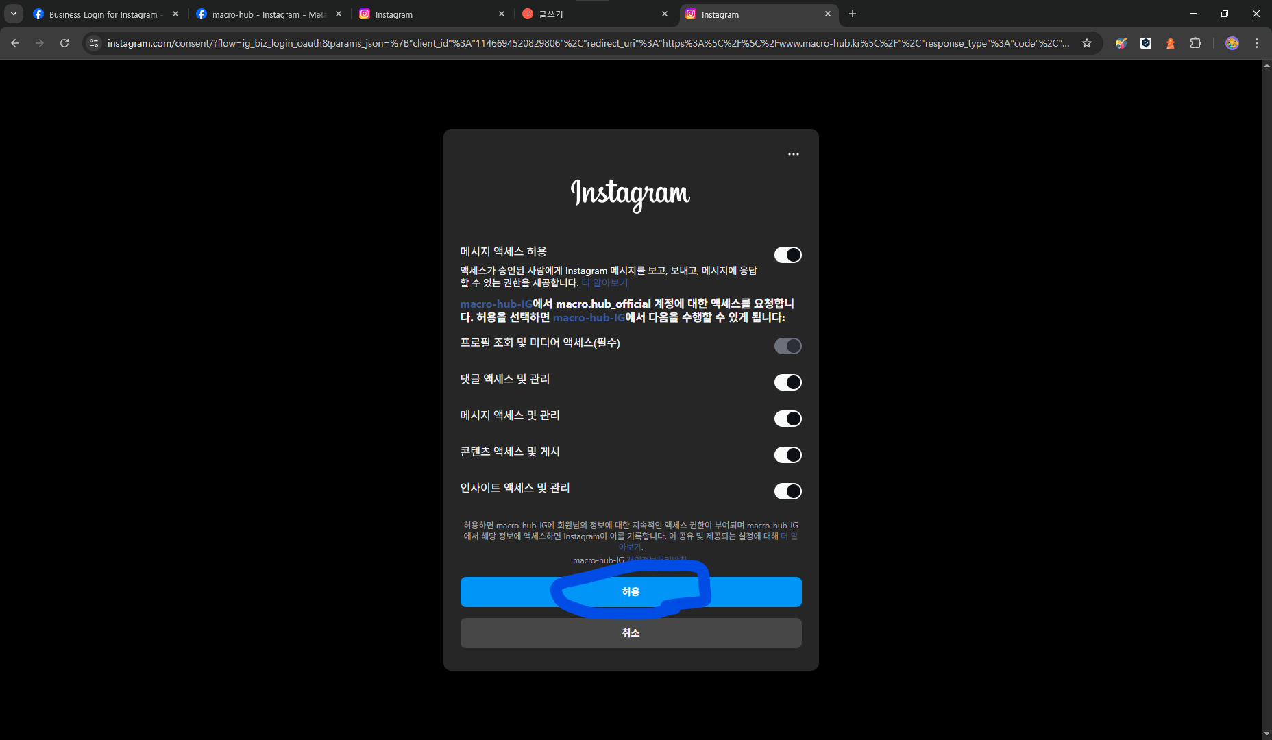 프로페셔널 계정 변환 후 다시 똑같은 링크로 접속하면 액세스 허용 창이 뜸