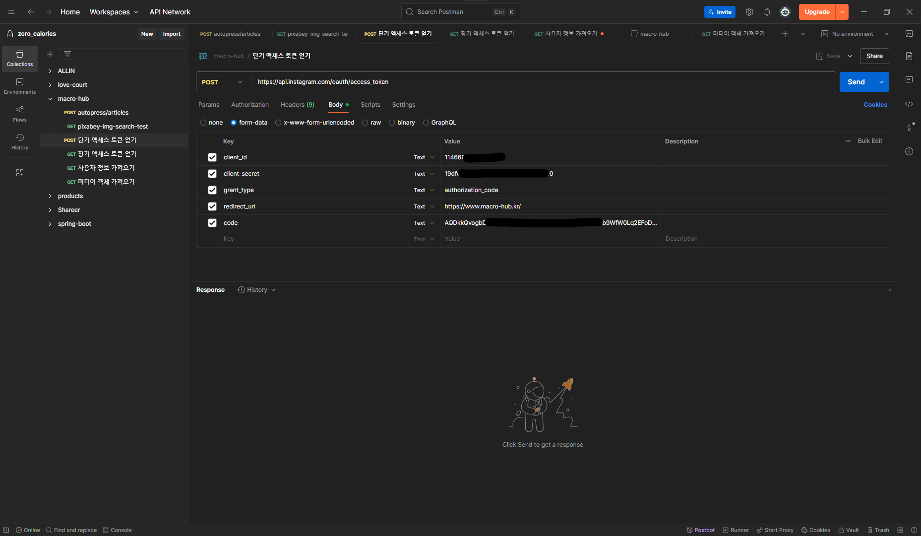 이 code값으로 단기 액세스 토큰과 장기 액세스 토큰을 발급 받을거임