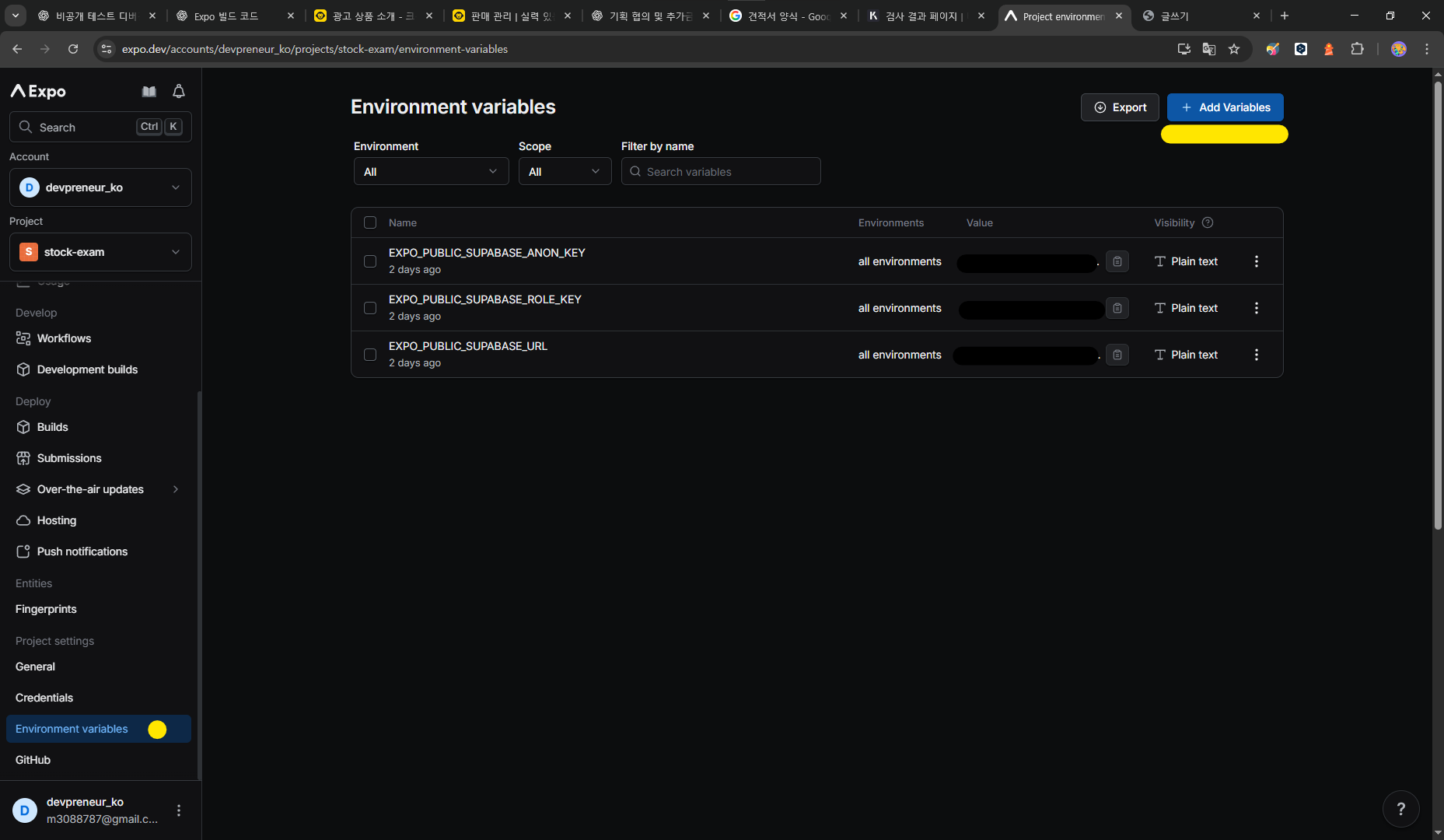 + 메모/주의: `.env`는 커밋 금지(.gitignore). 클라이언트에서 쓰는 값만 `EXPO_PUBLIC_` 접두사 사용. 서비스 롤 키 같은 비밀키는 절대 넣지 말고(서버 전용), `npm run prebuild` 같은 검증 스크립트로 필수 키 체크하면 좋아.