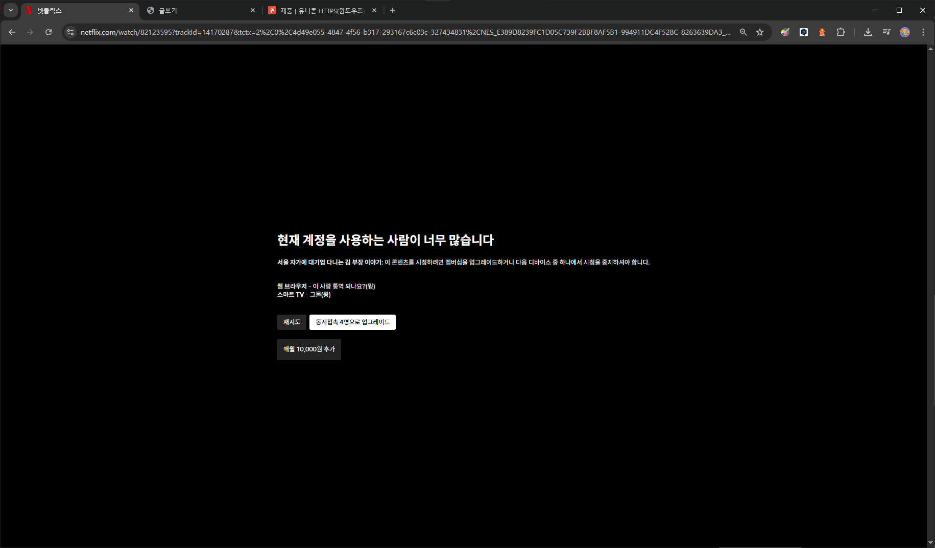 넷플릭스에 접속했더니 "현재 계정을 사용하는 사람이 너무 많습니다"라는 문구와 함께 영상 재생이 멈췄습니다.