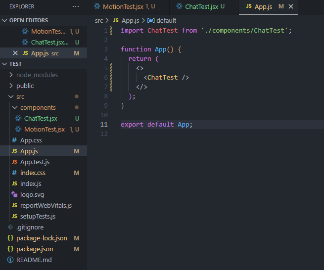 2.1 ChatTest.jsx 파일을 생성하고 아래 코드를 복사+붙여넣기 한다.